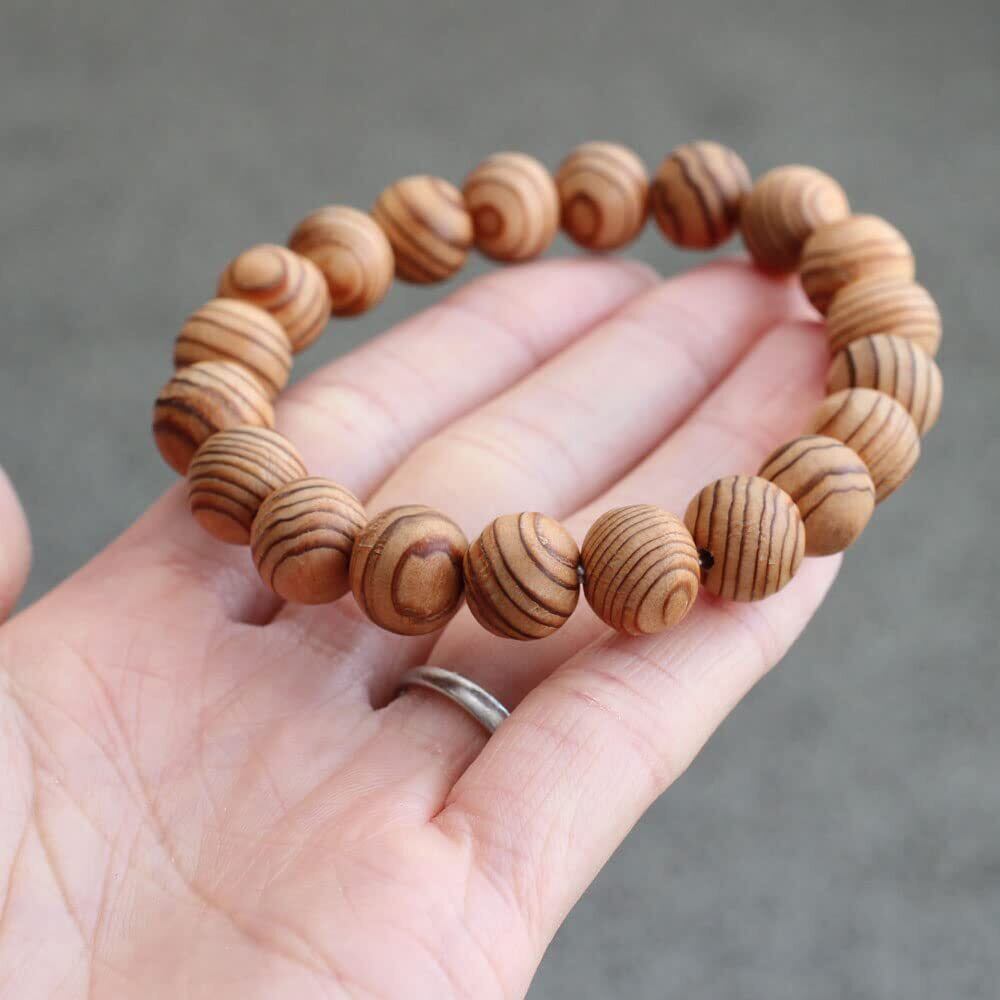 屋久杉を使用したブレスレットでございます。はっきりとした木目の美しい屋久杉をすべての玉に使用しました。軽く、腕の負担にならずにご愛用いただけます。こちらはやや大き目の玉サイズです。この他に、屋久杉の数珠ブレスレットもご準備ございます。