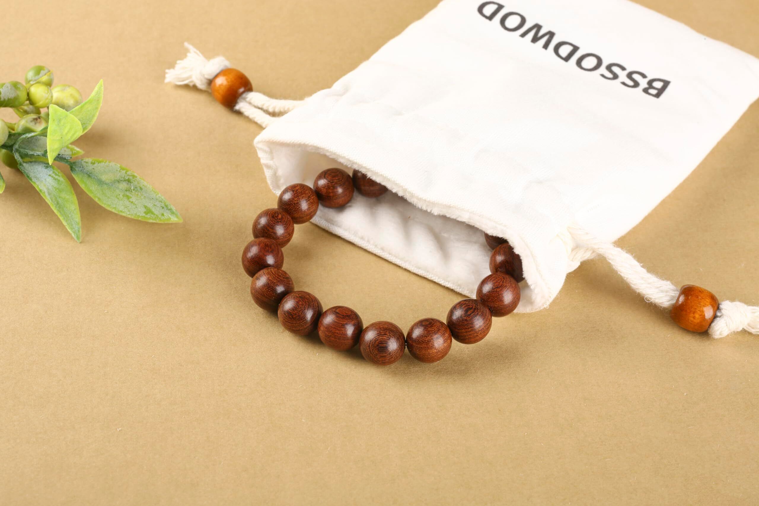 [BSSODWOD] ユニセックス 数珠ブレスレット、天然木材製、手作り、12ミリビーズ、チェーン長20センチ、伸縮性弾力仕様。瞑想・祈願・運気アップに適し、エレガントな布袋付き。家族や友人へのギフトとしても最適です。