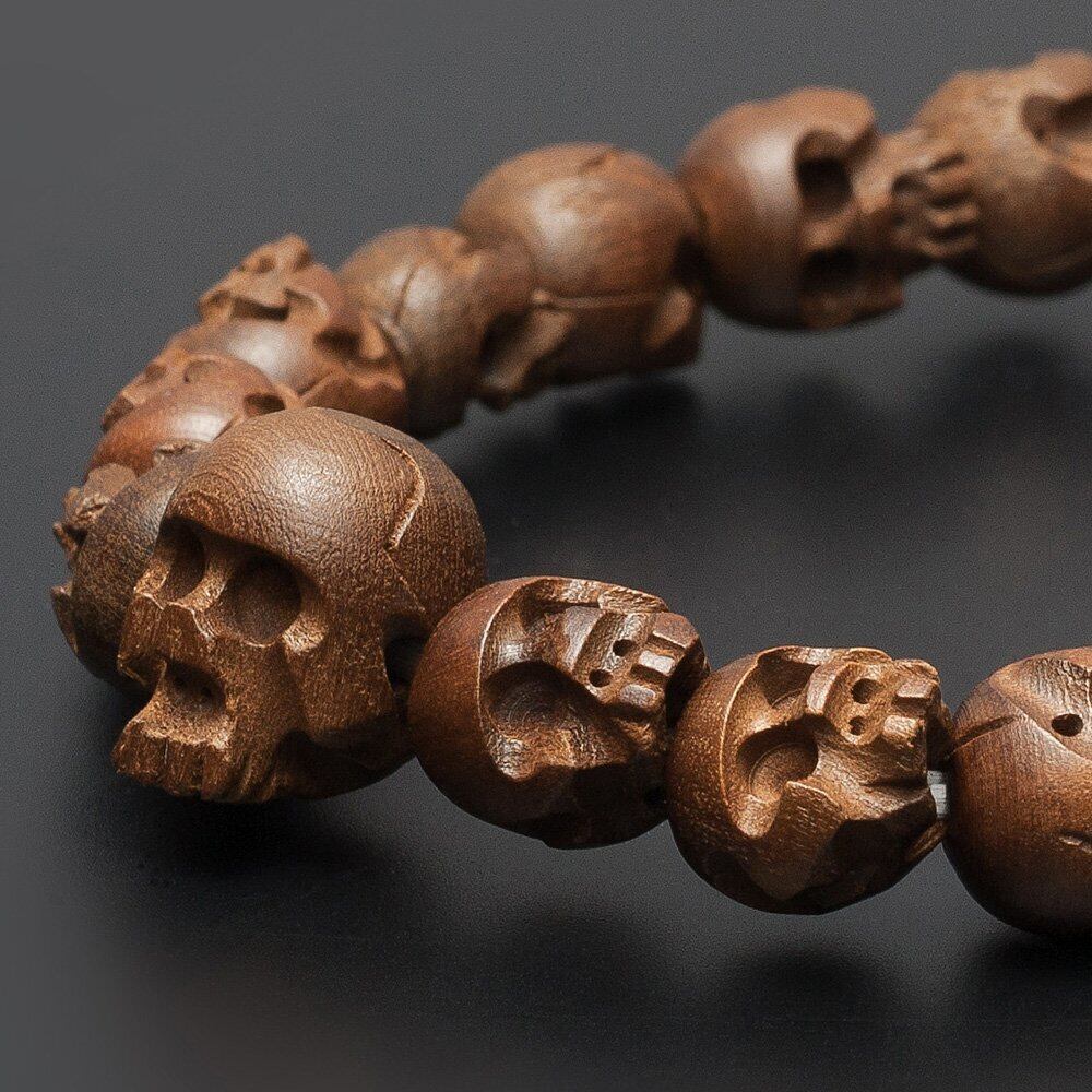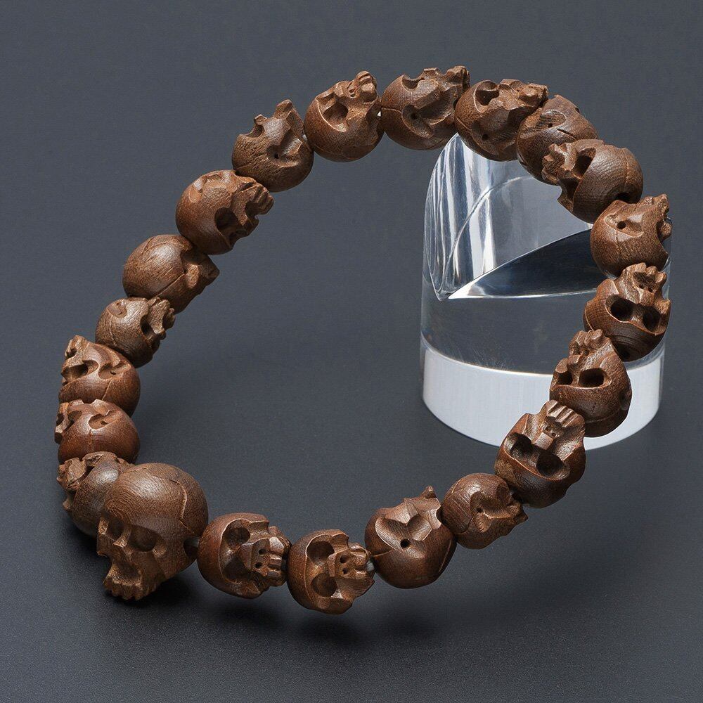 細かく、立体的な骸骨彫りを施したこちらの腕輪念珠は、神秘的な雰囲気を感じさせてくれます。骸骨には古来より、魔よけや厄除けのお守り効果があるとして大切に使われてきました。