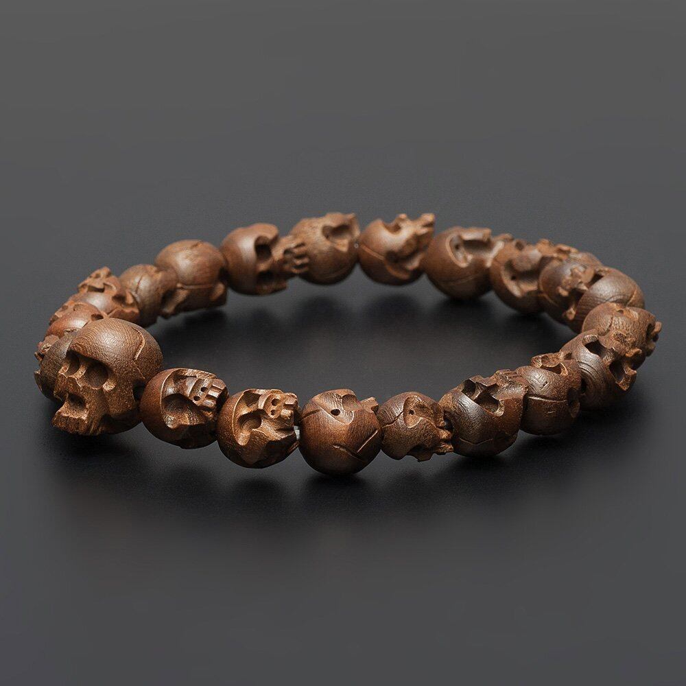 シックで落ち着いた色艶の柘植に、貫禄の骸骨彫り加工を施した腕輪念珠(ブレスレット)です。