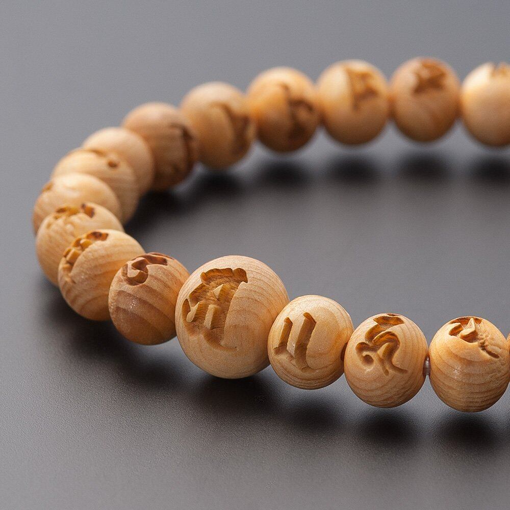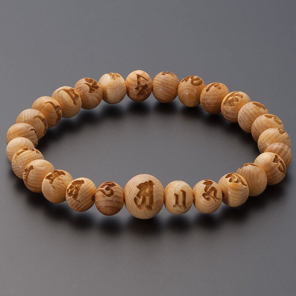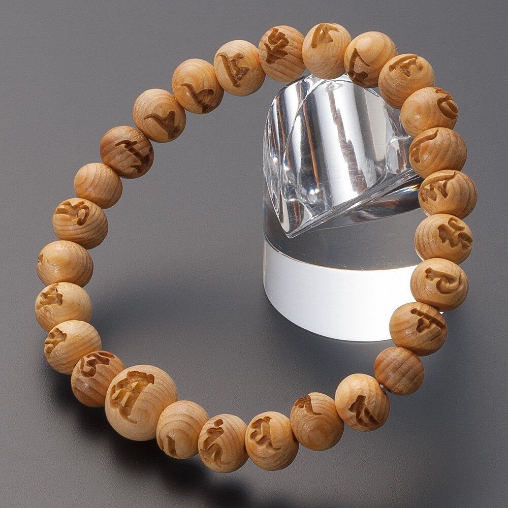 仏壇屋 滝田商店 特選 腕輪念珠 木玉ブレスレット 光明真言彫入り 木曽桧「官材(かんざい)」 8mm玉(尺二玉)◆ 最強の厄除け 梵字 数珠 ブレスレット・数珠ブレス・四国 お遍路 お守り 【滝田商店発行 証明書付】
