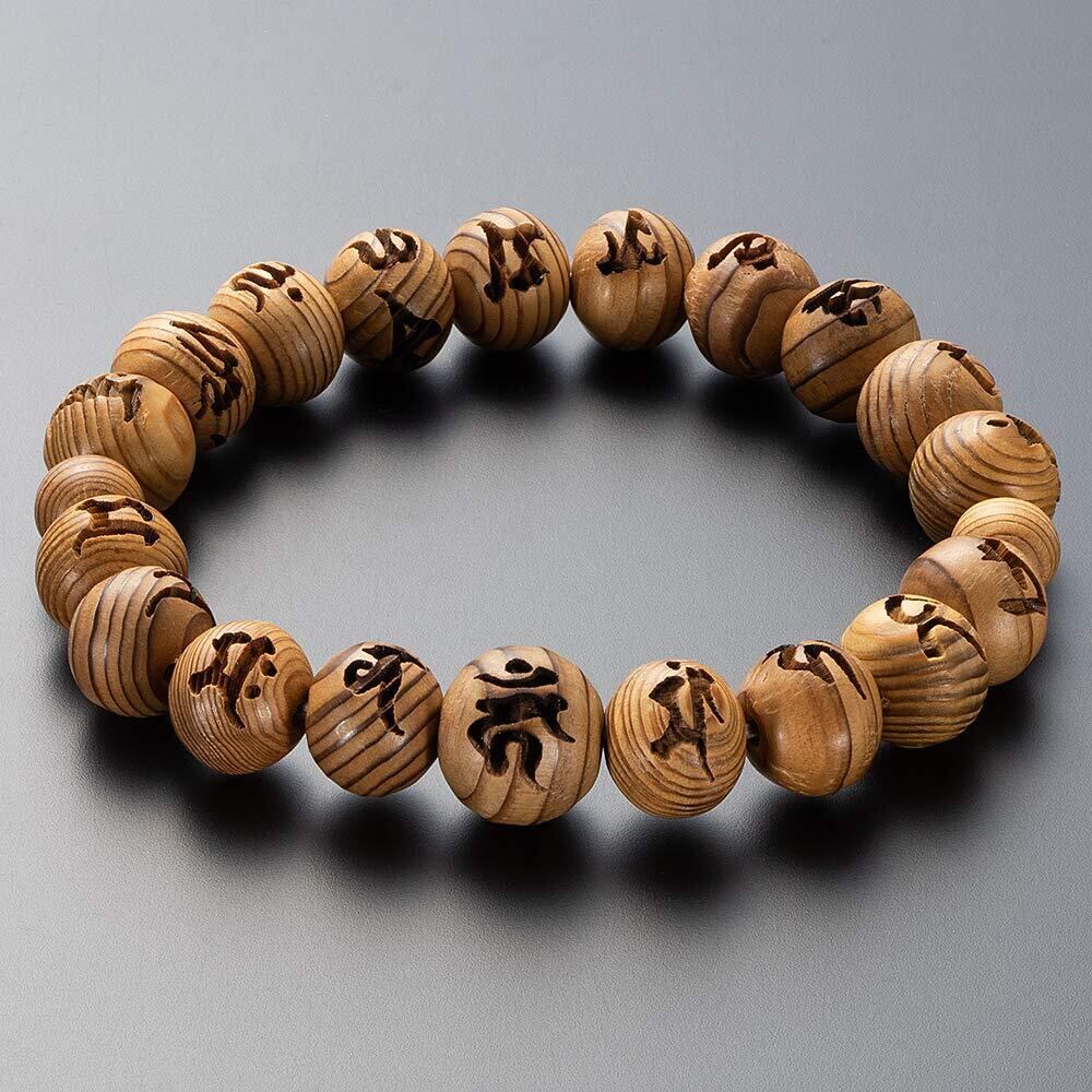 世界遺産でもある屋久島に自生する屋久杉に、「不動真言(ふどうしんごん)」を彫り込んだ腕輪念珠(ブレスレット)です。屋久杉は現在、伐採が禁止になっており、台風などで倒れた倒木など一部のみ採取が許可されている稀少な高級素材になります。1000年以上も過酷な自然環境の中で生き続ける屋久杉は、自らの身を守るため豊富な樹脂分を持ち、その樹脂分が癒しの香りを放ちます。