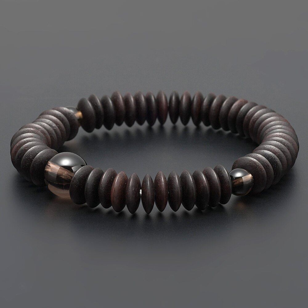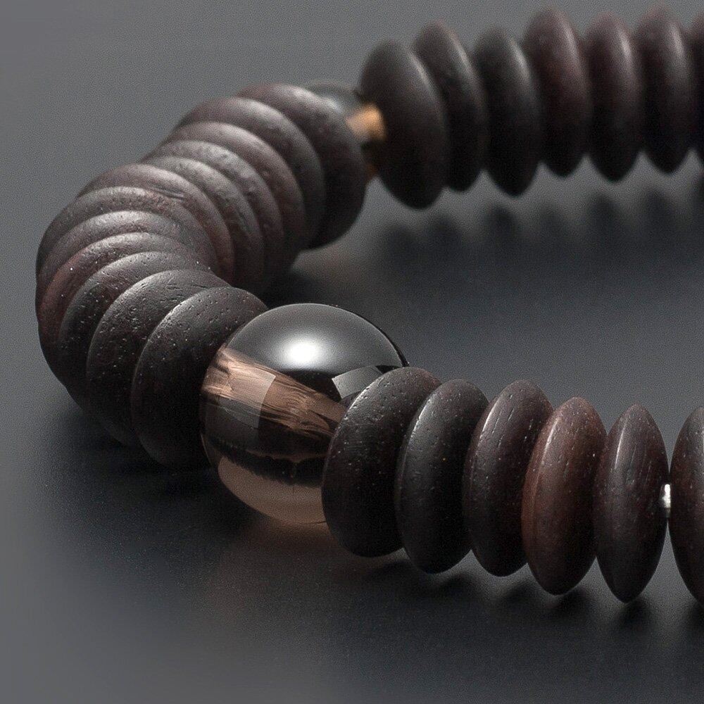 美しい木目が特徴的な銘木の縞黒檀を使用し、アクセントに茶色く透きとおった美しい茶水晶を使用した腕輪念珠(ブレスレット)です。