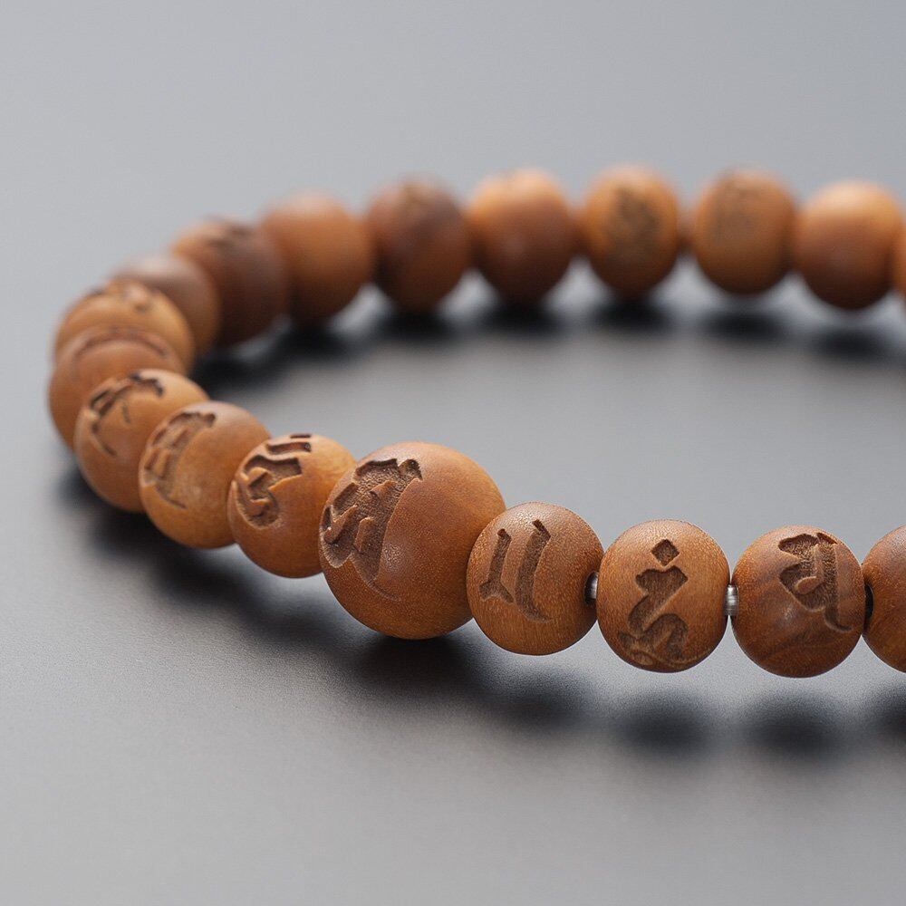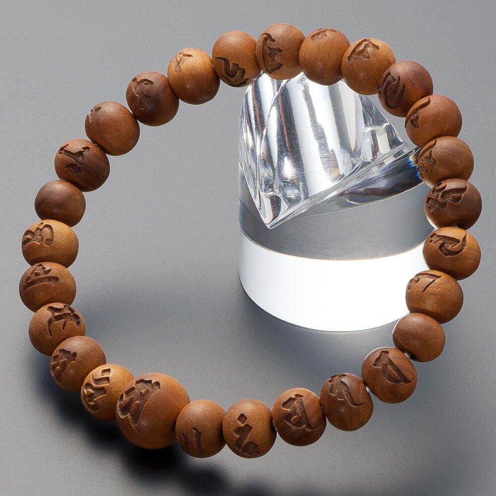 白檀の中でも、最上品であるインド白檀に、「光明真言(こうみょうしんごん)」を彫り込んだ腕輪念珠(ブレスレット)です。インド白檀は高品質のお香の原料として使用されますので香りも格別で、心を癒してくれる上品な香りを味わって頂くことが出来ます。