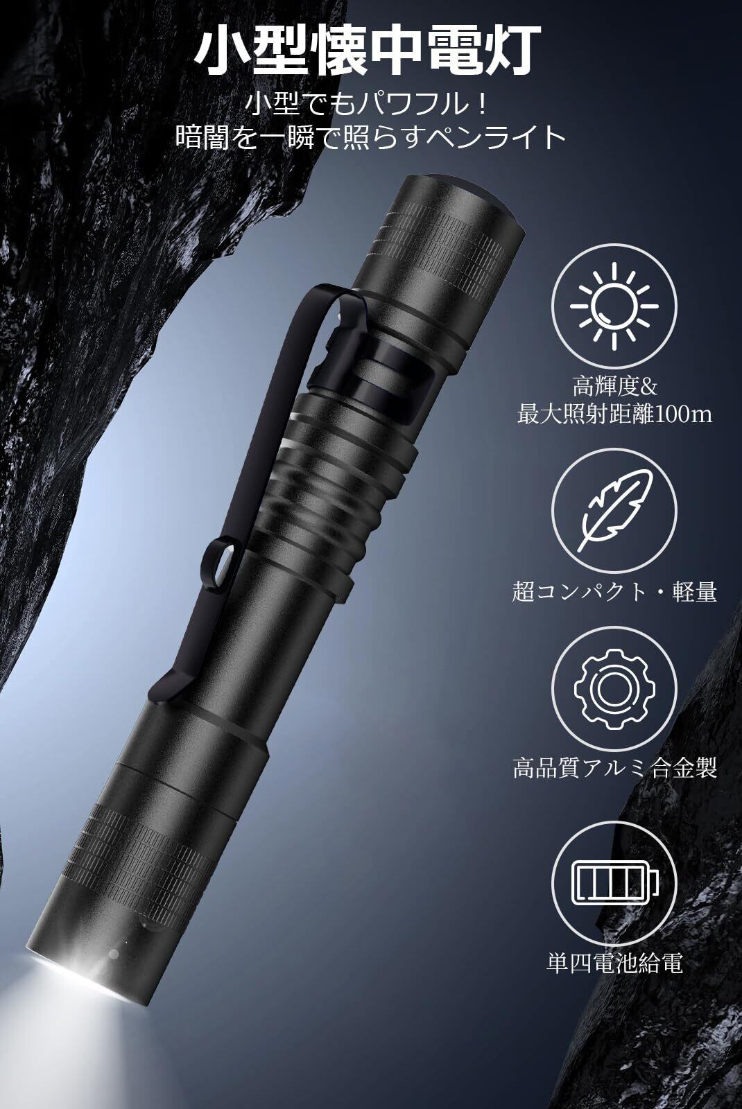 LED懐中電灯 超軽量 小型 ペンライト 120ルーメン 高輝度 XPEチップ搭載 最大照射距離100m 高演色 防水 アルミ合金製 クリップ&ストラップ付き 単四電池式 防災グッズ 作業灯 アウトドア キャンプ 釣り 登山 緊急用 避難/地震/停電対策(充電池対応不可)ブラック