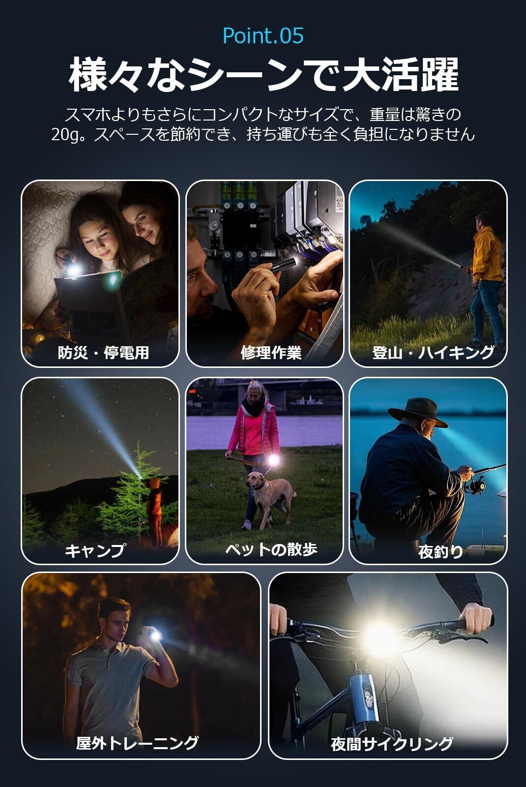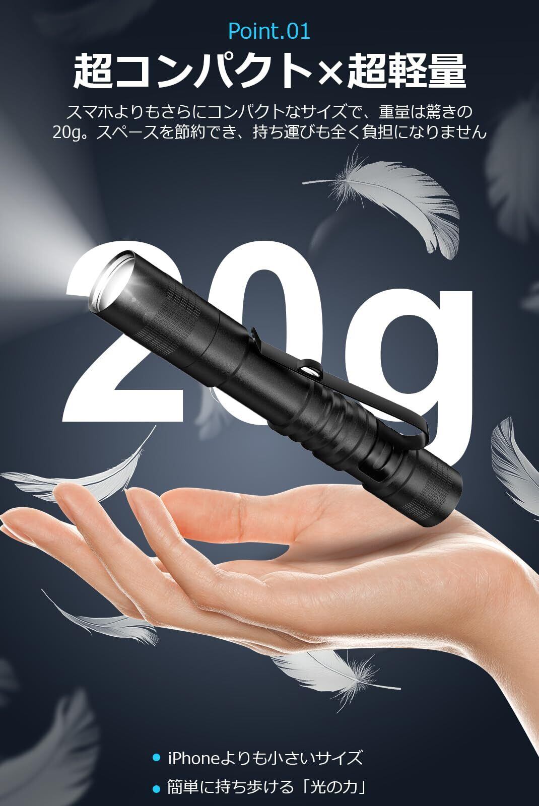 【スマホより小さい超軽量LED懐中電灯】長さ9cm×直径1.5cmの超コンパクトサイズ、重さはわずか20gの小型懐中電灯。スマートフォンよりも小さく、ポケットや小さなバッグ、ポーチにもすっきり収まります。軽量設計なので持ち運びやすく、長時間持ち歩いても負担にならず、通勤・通学・旅行などの外出時に便利に使えるだけでなく、室内作業や修理にも最適です。暗いクローゼット内での作業や机上での詳細作業などにも活躍します。必要な時にすぐ取り出せる安心感をお届けします。