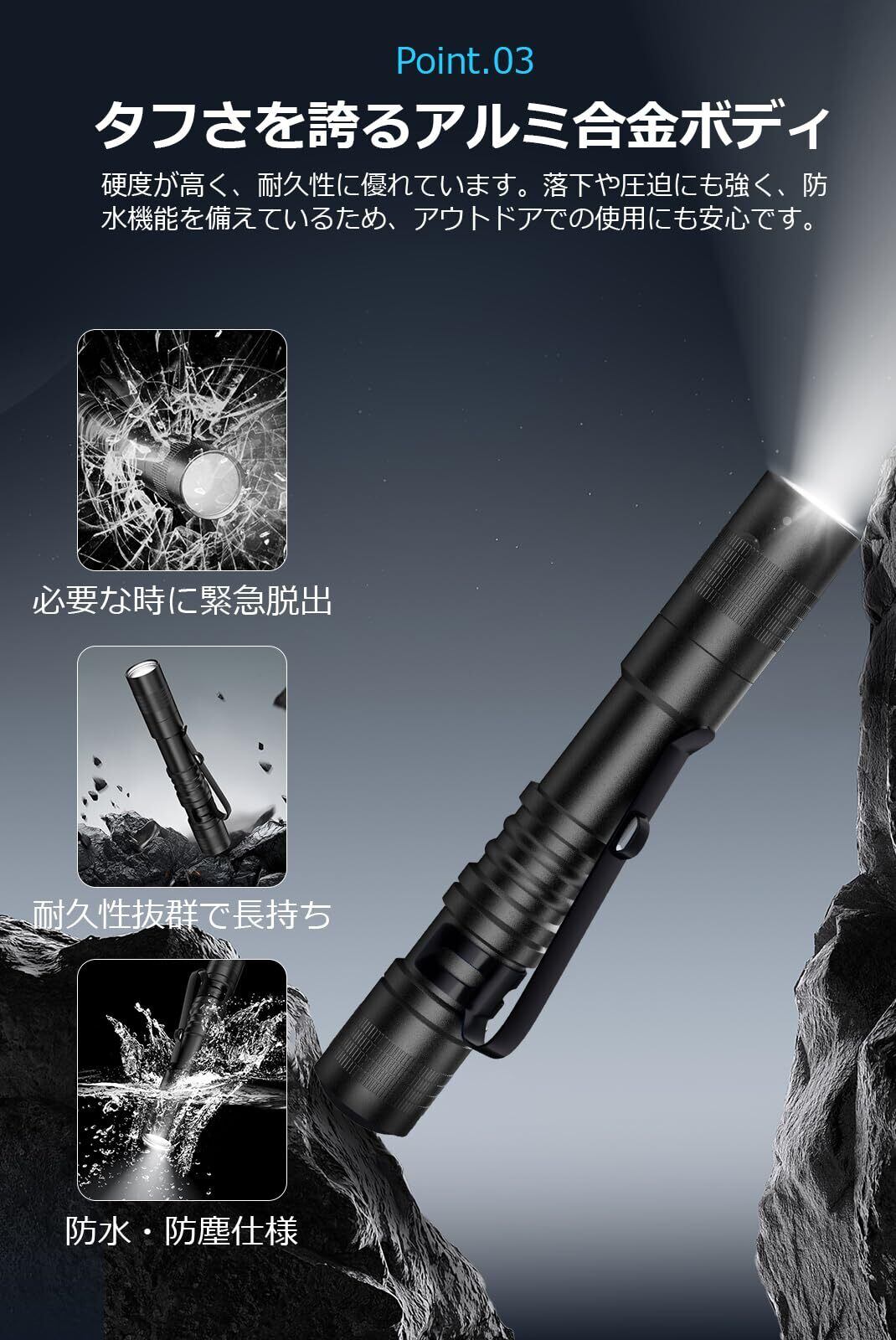 ️【頑丈なアルミ合金製、防水&耐衝撃】高品質アルミ合金を採用した小型懐中電灯、軽さと強さを両立。高所からの落下や重い物の圧迫にも耐えられる頑丈な構造、耐衝撃性抜群、耐摩耗性にも優れています。密閉性が高く、防水仕様で雨天や水しぶきの中でも安心して使用可能。アウトドアや日常使用でも長くお使いいただけます。手に馴染む質感で握りやすく、修理作業中にうっかり落としても壊れにくい設計で、非常時や過酷な環境でも頼りになります。