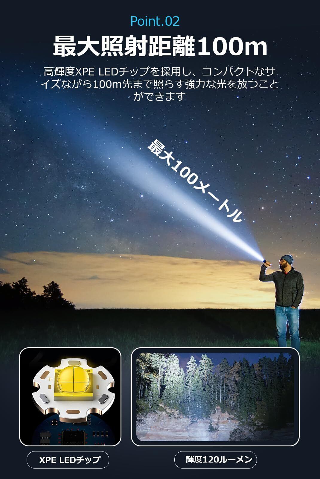 【120ルーメンの明るさ&高演色性LED】高輝度XPE LEDチップを採用したLED懐中電灯で、最大120ルーメンの明るさを実現。照射距離は最大100mと、夜道でも遠くまでしっかり見渡せます。高演色性の光は対象物の色をより自然かつ鮮やかに再現し、細部までくっきり。均一な配光により、スポットも周辺光も見やすく、作業台や書斎での精密作業、夜間の修理作業、車内でのライト作業にも理想的です。また、キャンプや夜間ランニング、サイクリングにも活躍します。