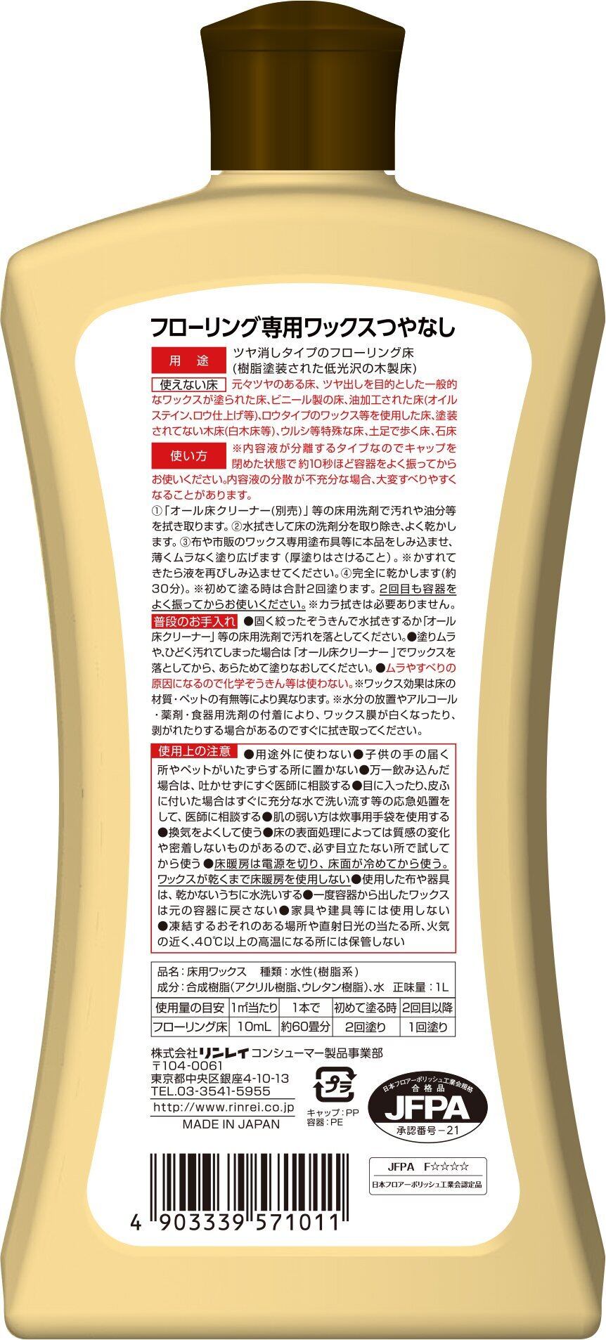 リンレイ フローリング専用ワックス つやなし 1L