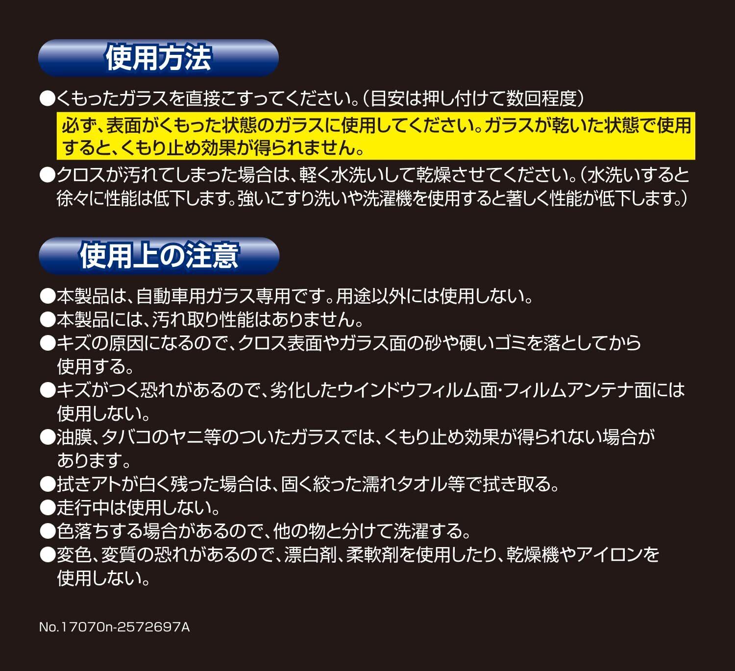 ●くもったガラスを直接こすってください(乾いた状態ではくもり止め効果が得られません)●クロスが汚れてしまった場合は、軽く水洗いして乾燥させてください