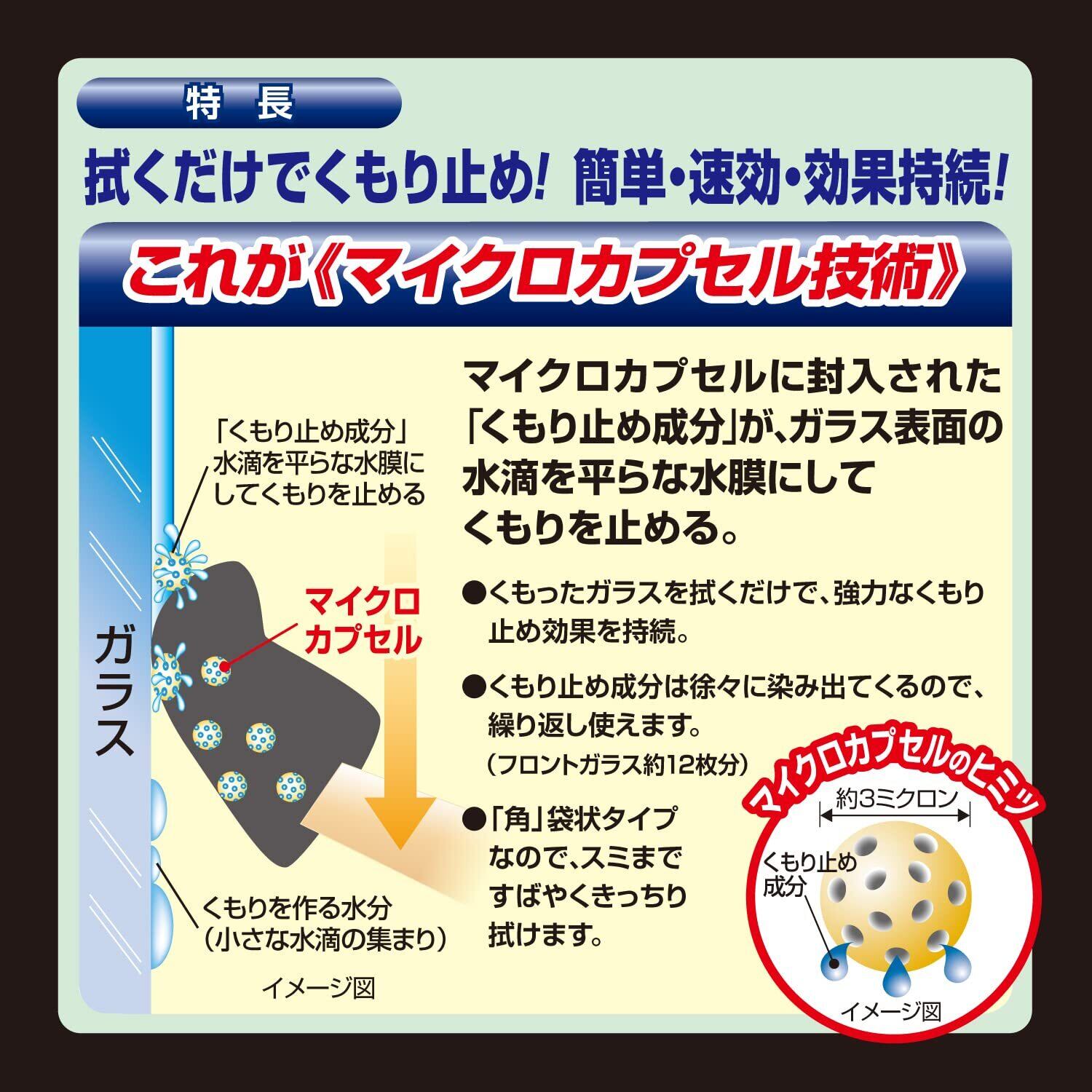 ●マイクロカプセルに封入された「くもり止め成分」が、ガラス表面の水滴を平らな水膜にしてくもりを止める●くもったガラスを拭くだけで、強力なくもり止め効果を持続●くもり止め成分は徐々に染み出てくるので、繰り返し使えます●「角」袋状タイプなので、スミまですばやくきっちり拭けます