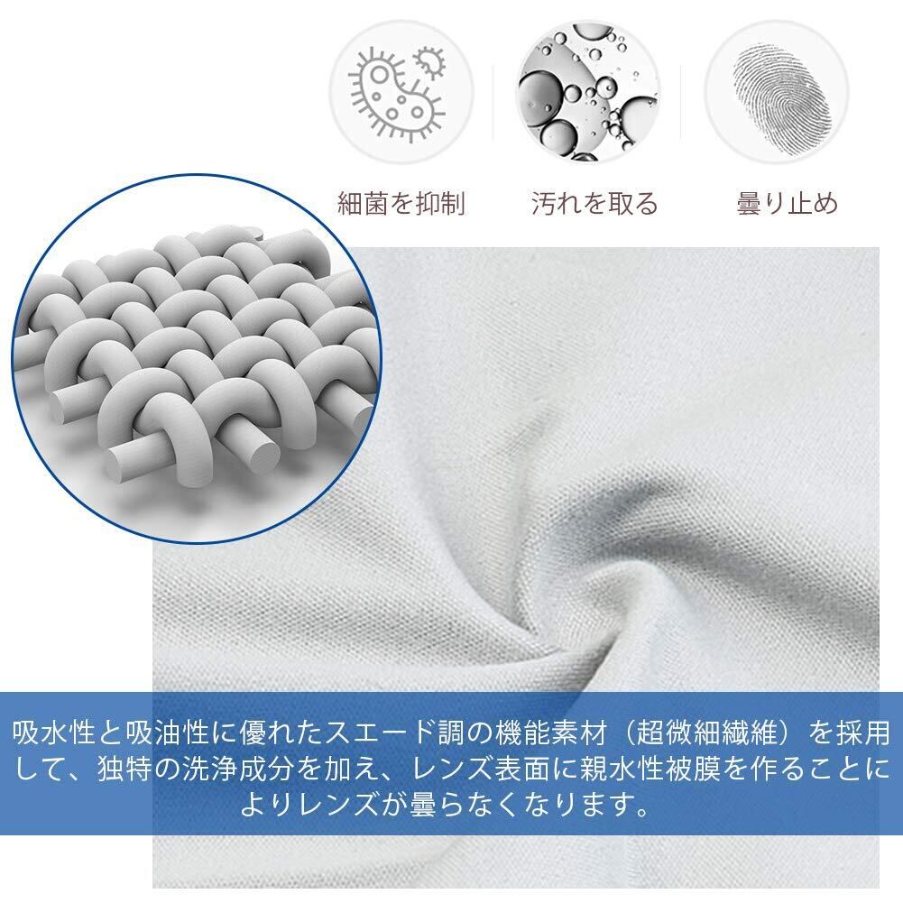 【くもり止め】吸水性と吸油性に優れたスエード調の機能素材(超微細繊維)を採用して、独特の洗浄成分を加え、レンズ表面に親水性被膜を作ることによりレンズが曇らなくなります。食事の時、通勤時など、いろいろな助けになるメガネくもり止めクロスです。