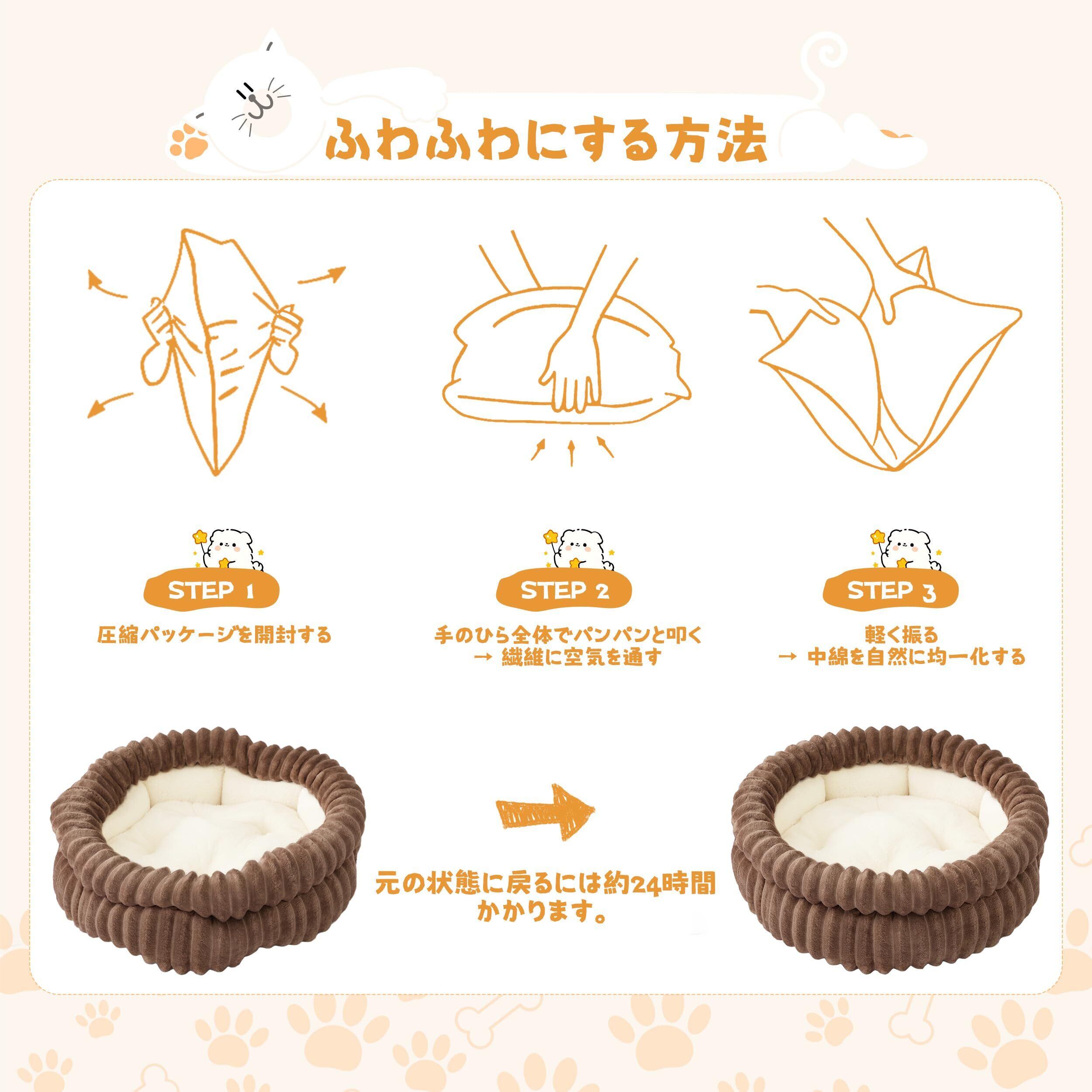 【2サイズ展開+衛生的梱包】M:50×50×20cm(〜5kg)、L:60×60×22cm(〜10kg)。圧縮梱包でお届けし、開封後は形を整えると数時間でふんわり戻ります。