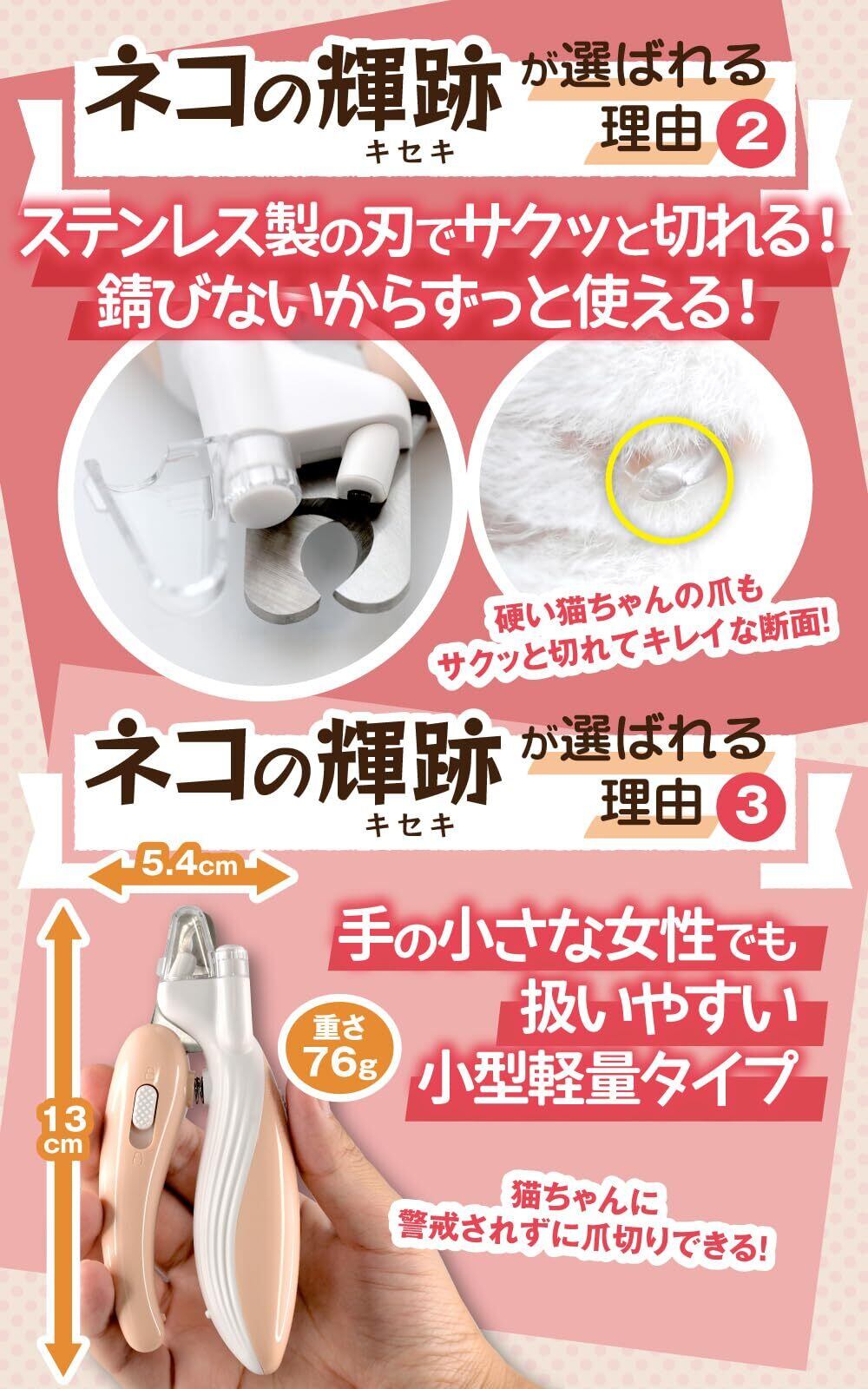 【猫ちゃんに好まれやすいカラーリング】ピンクは好きな猫ちゃんが多い色と言われています。そこで、持ち手に淡いピンクを採用し、猫ちゃんが安心して爪を切らせてくれるようにしました。