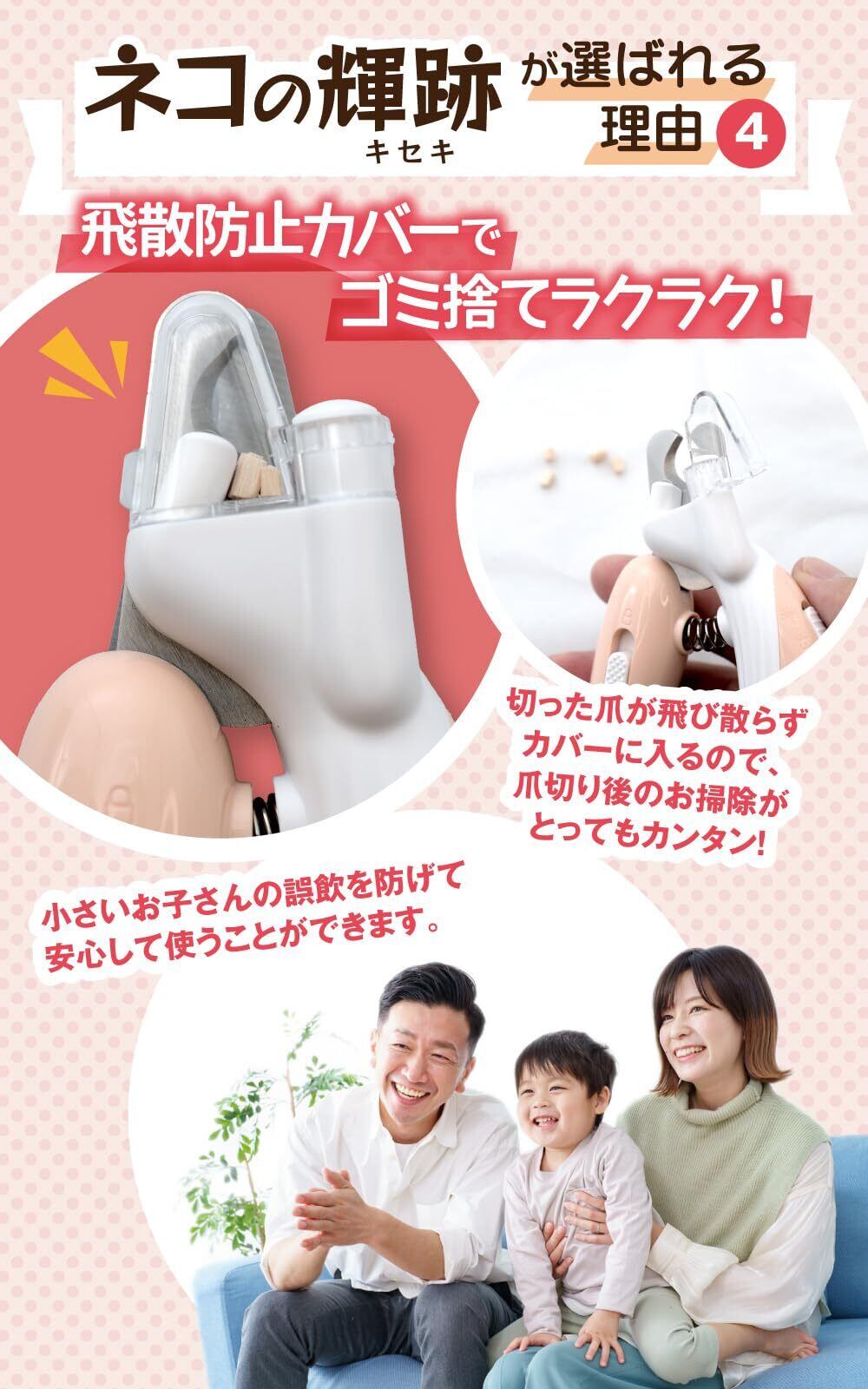 【飛散防止カバー付き】切った爪が飛び散るとお掃除が大変ですよね。小さい赤ちゃんがいる家庭だと誤飲のリスクもあります。ネコの輝跡(キセキ)には飛散防止カバーがついているため、サクサク切っても爪が飛び散らず、本体に貯まります。爪切り後にカバーを外して捨てるだけなので、ラクチンです。