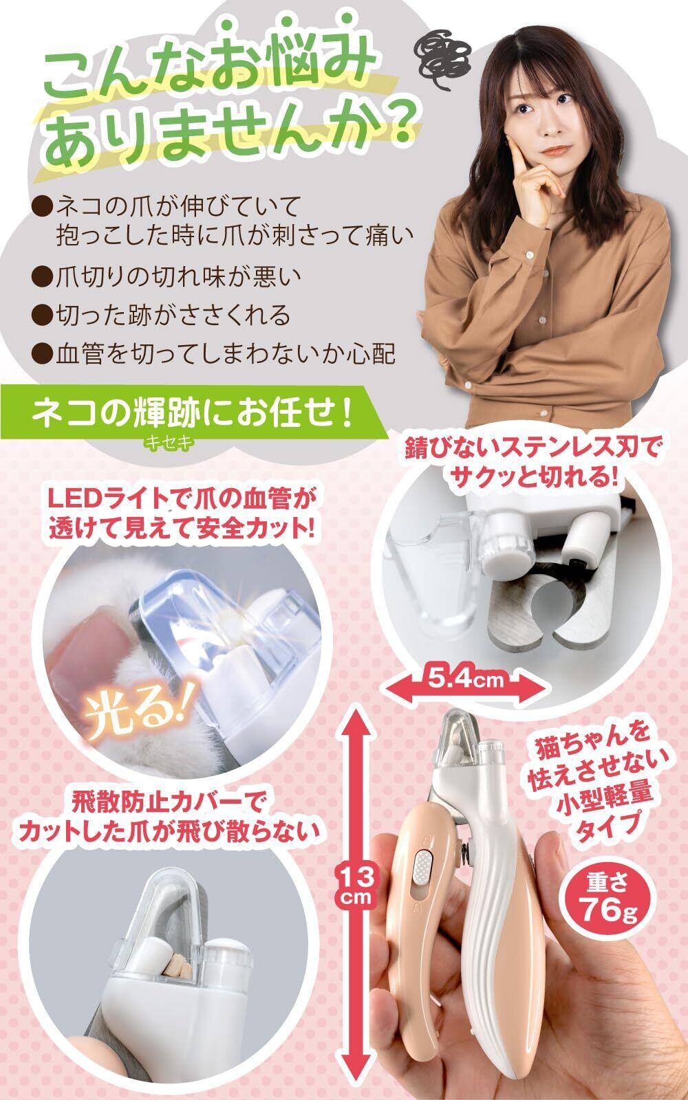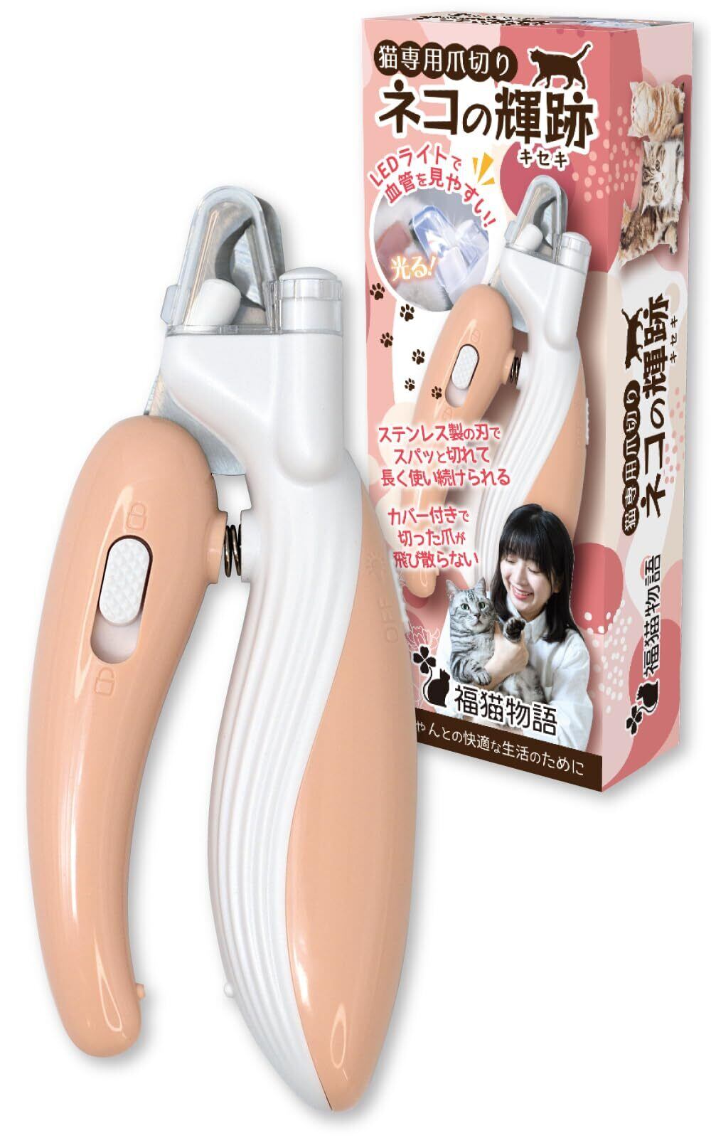ネコの輝跡(キセキ) 福猫物語 猫専用爪切り LEDライト 飛散防止カバー 電池付属 ステンレス製 サクサク切れる