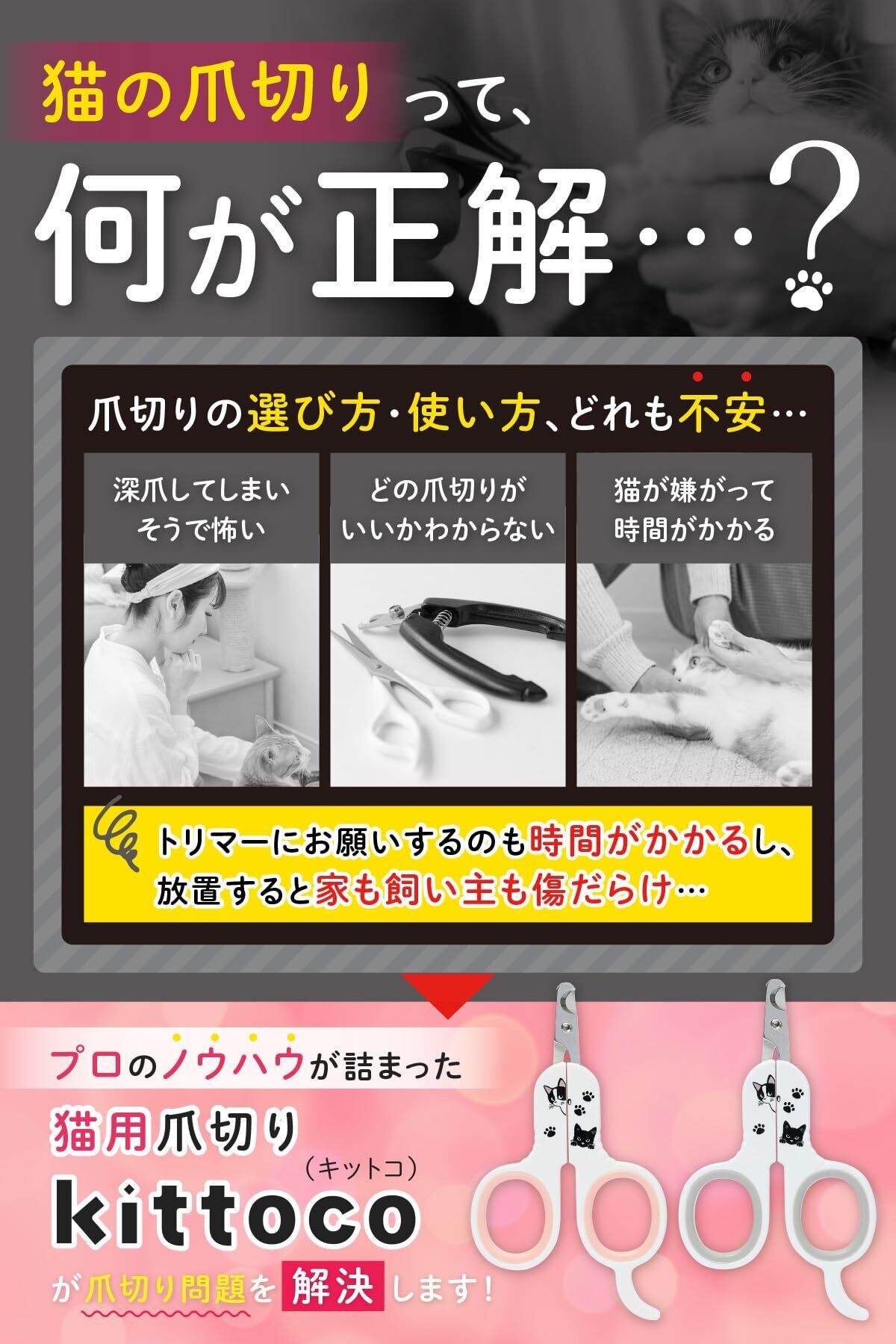 【猫好き300人の声を形に】 収納しやすいコンパクト設計、力を入れやすいグリップ、可愛い猫イラスト付き。猫好きの意見を反映した、まさに理想の爪切り。