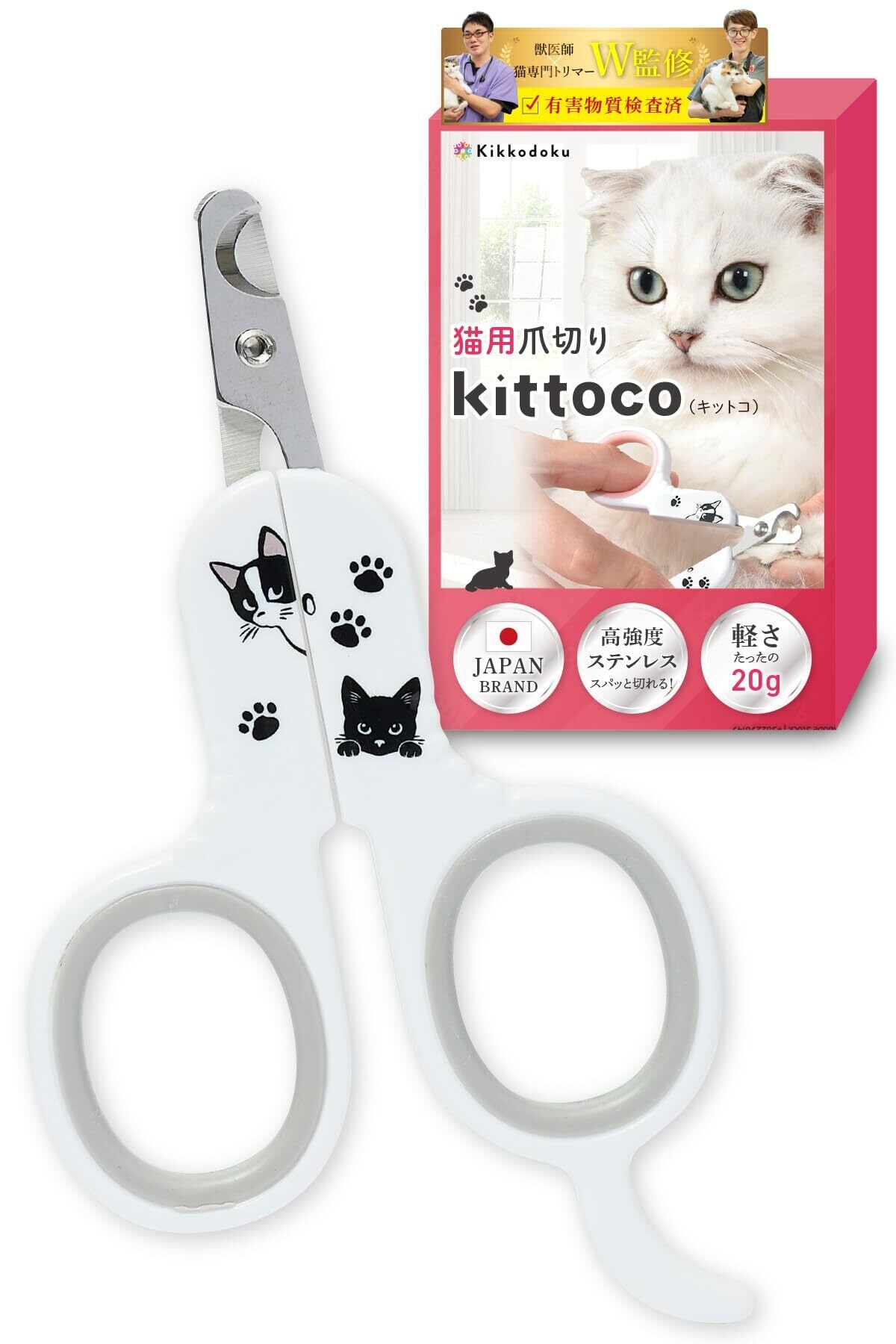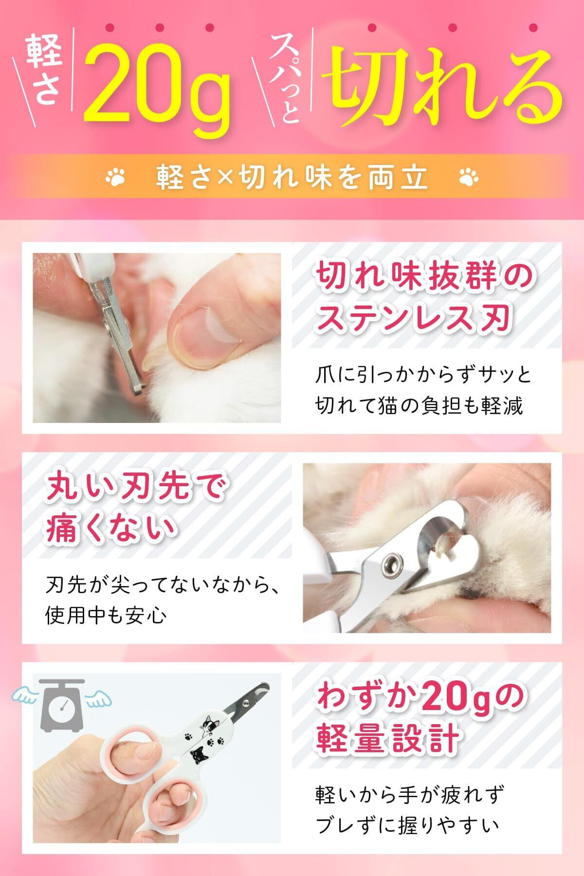 【猫好き300人の声を形に】 収納しやすいコンパクト設計、力を入れやすいグリップ、可愛い猫イラスト付き。猫好きの意見を反映した、まさに理想の爪切り。