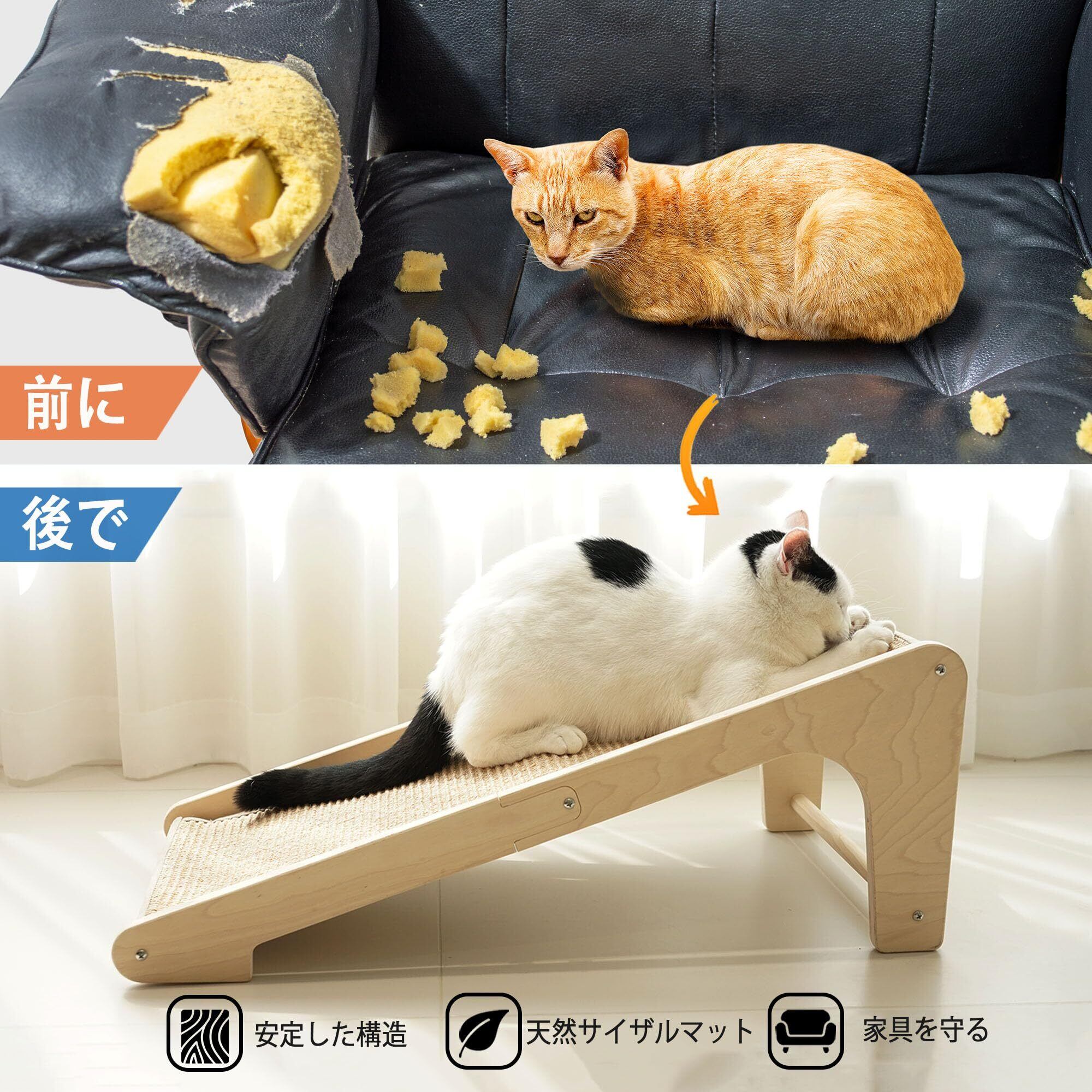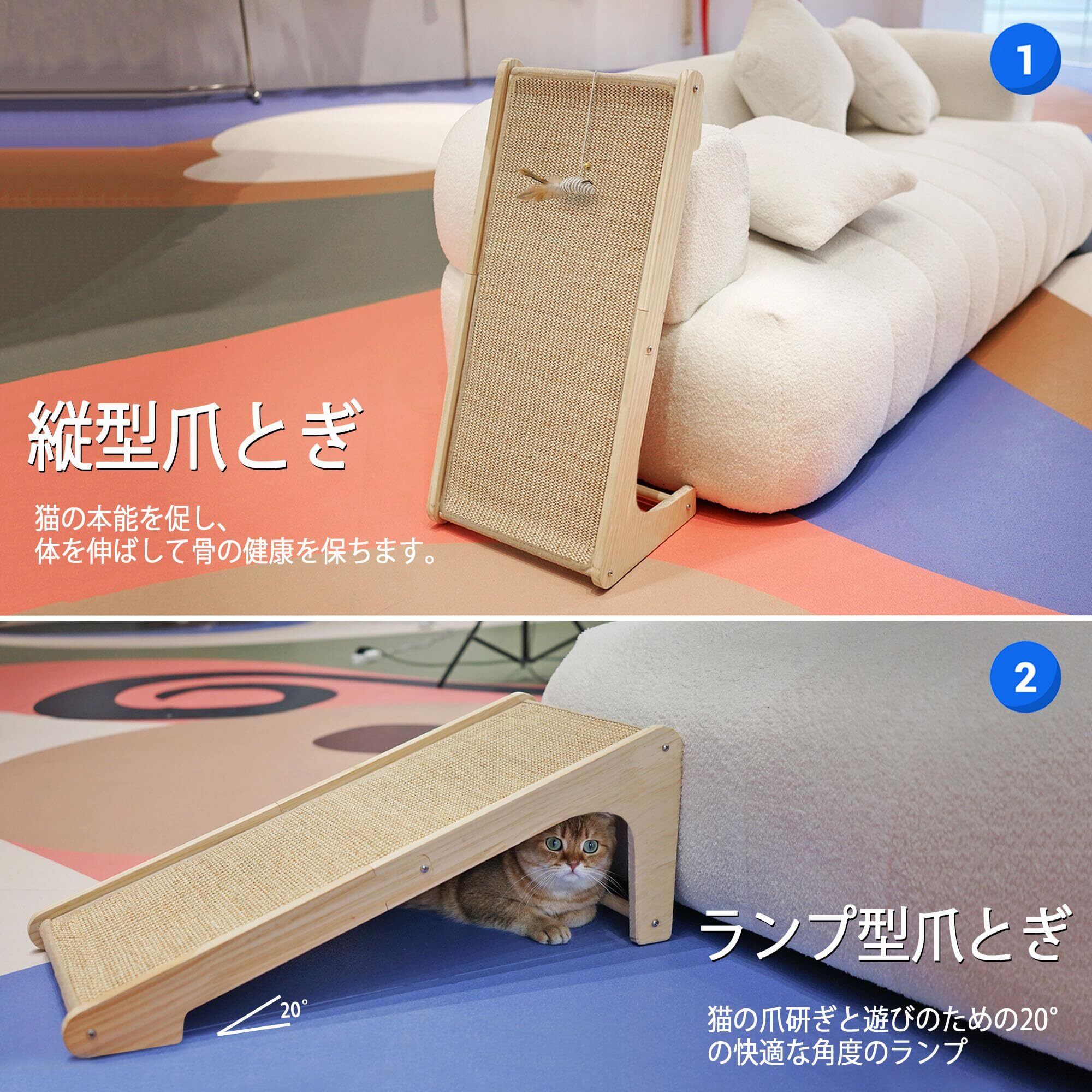 爪とぎスロープ: 2通りの設置方法 - 床に置いてスロープとして使用するか、ベルクロで壁に取り付け可能。猫が快適に爪をとげる20°の角度設計。