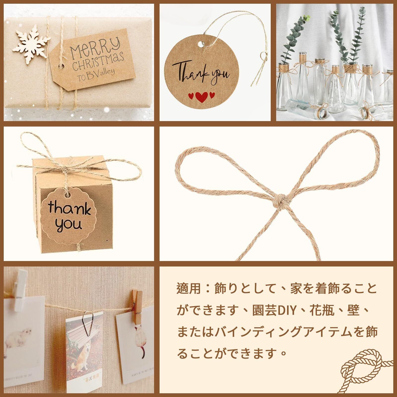 【3mm適用場所】3mmの麻ひもが自分好きなもの、自分好きの方法でギフトをタイできます。飾りとして、家を着飾ることができます、園芸DIY、花瓶、ギフト包装、カードストラップ、壁飾り、手芸や飾りに適しています。