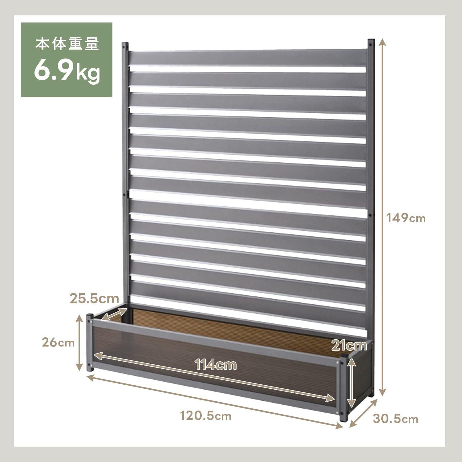 【仕様】本体サイズ:幅120.5×奥行30.5×高さ149cm/プランター部内寸:幅114×奥行25.5×高さ21cm/重量:6.9kg/材質・構造部材:アルミ、表面加工:ポリエステル塗装/カラー:グレー/組立品(組立時間:約30-40分)