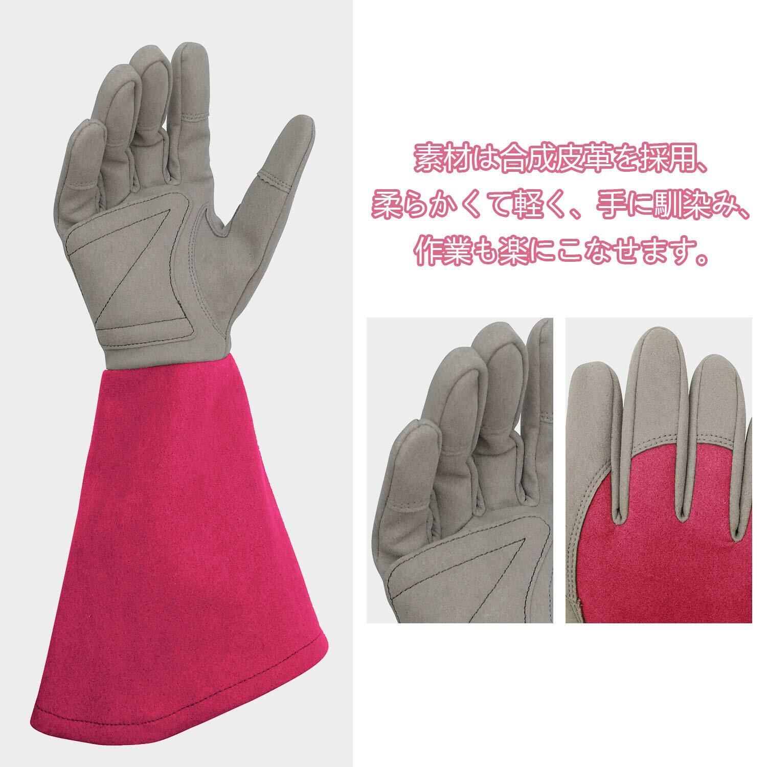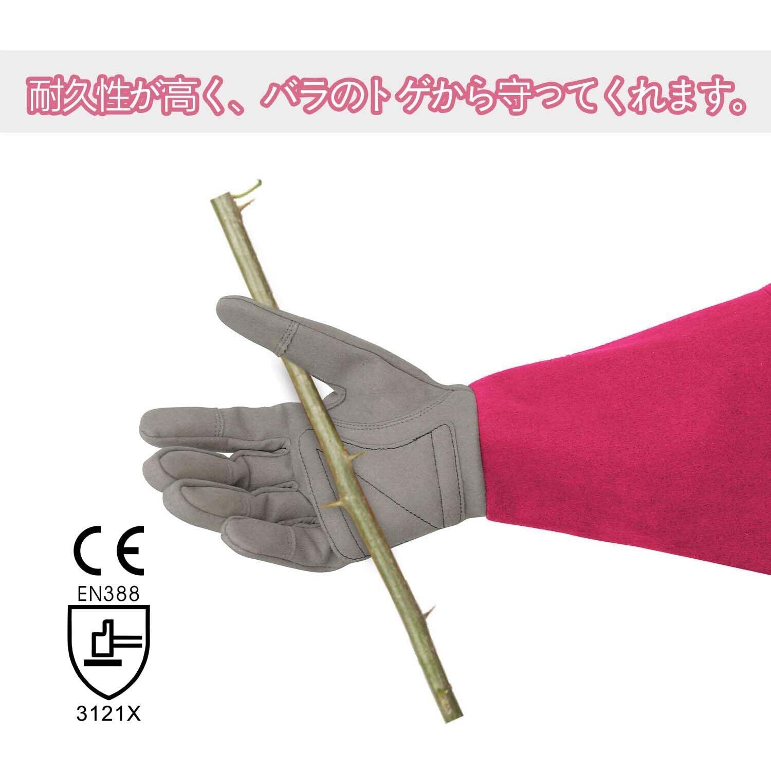 指先と手のひらの部分に合成革が補強され、バラなどの刺や枝の切り口から手を守ってくれます。.全長が35センチ以上の長袖仕様で、腕や肘の部分は刺さりにくいです。
