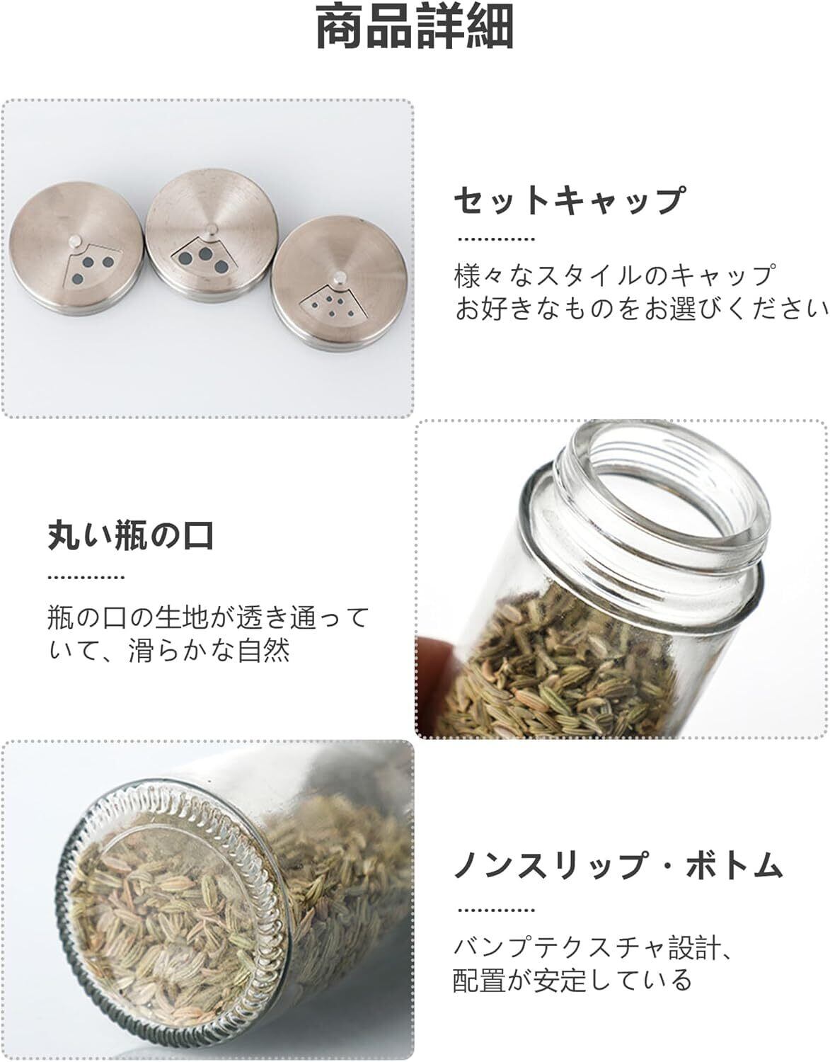 【材質】調味料瓶の蓋(外側のキャップ)には、錆びにくく耐久性に優れたステンレス製のつまみが付いています。瓶本体は高品質の耐熱ガラス製で、熱膨張係数が低く耐熱性に優れています。