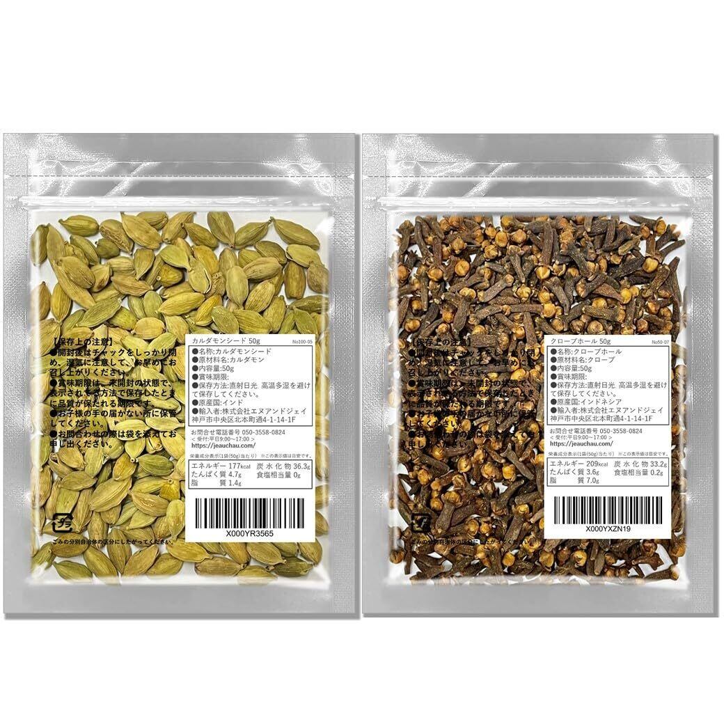 【商品詳細】内容:カルダモンシード 50g(グアテマラ産) クローブホール 50g(インドネシア産) / 賞味期限:収穫から約2年 / 保存方法:直射日光、高温多湿を避けて保存してください。※保存に便利なチャック付き袋です。