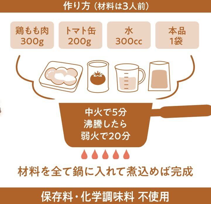 【作り方】 鶏肉や豚肉など(300g)、トマト缶(200g)、水300cc、本品を入れて中火で5分、弱火で20分煮込むだけでスパイスカレーが完成です。