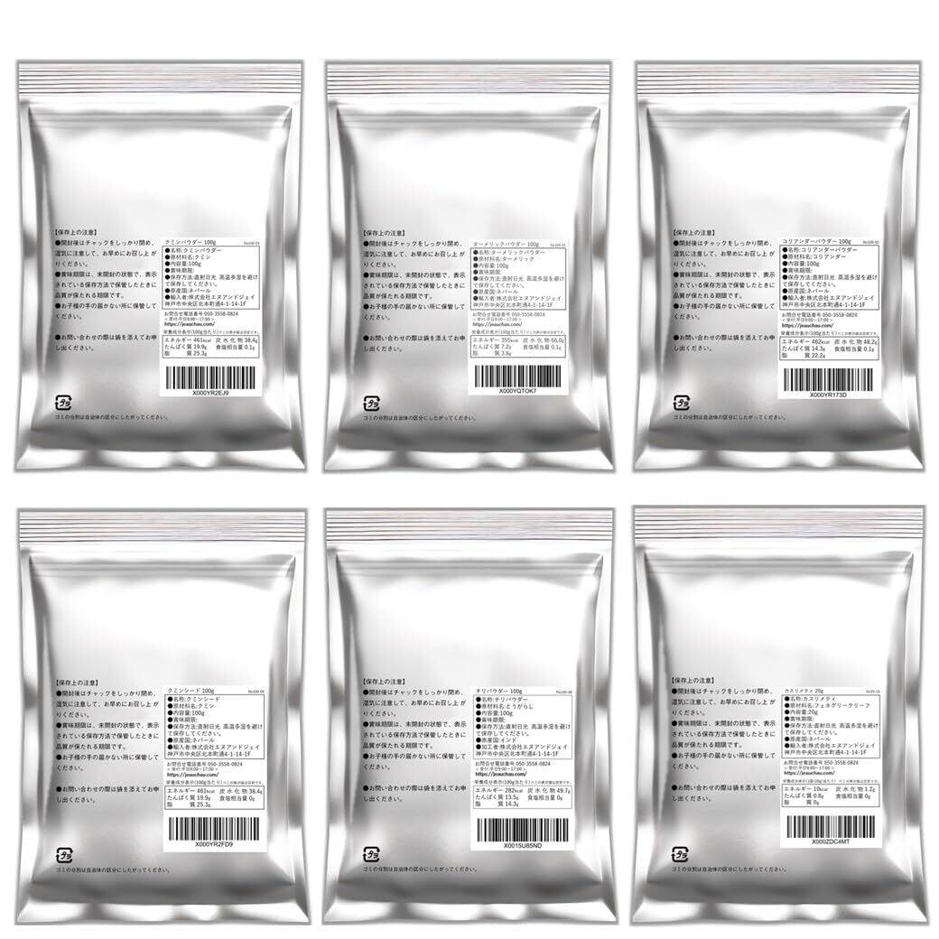 【商品詳細】内容:クミンパウダー100g(ネパール産) ターメリックパウダー100g(ネパール産) コリアンダーパウダー100g (ネパール産) クミンシード100g(ネパール産)チリパウダー100g(インド産)カスリメティ20g(ネパール産)/ 賞味期限:収穫から約2年 / 保存方法:直射日光、高温多湿を避けて保存してください。