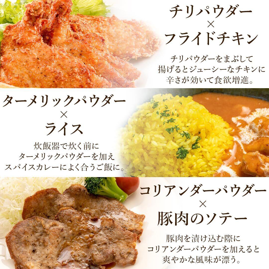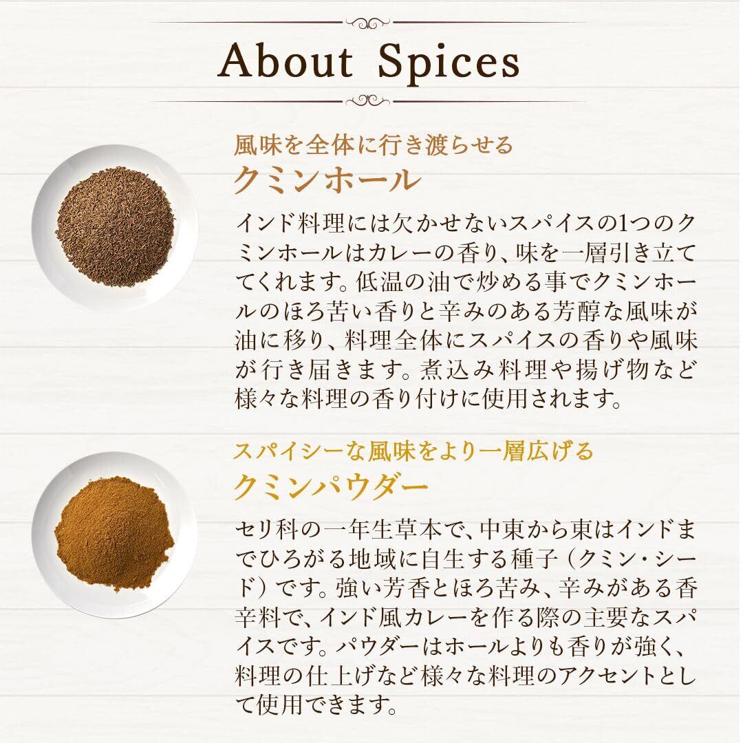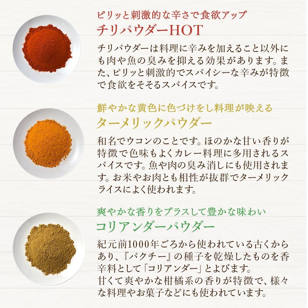 【D'stsカレースパイスの特徴】「ターメリック」「クミン」「コリアンダー」は、カレーづくりにマストなスパイス。どんな種類のカレーもベースにはこの3つを使うことが多いです。また「チリパウダー」は肉や魚の臭みを抑える効果があり、スパイシーな辛味で食欲をそそります。あらかじめ必要なスパイスが必要なだけ揃っているスパイスセットです。
