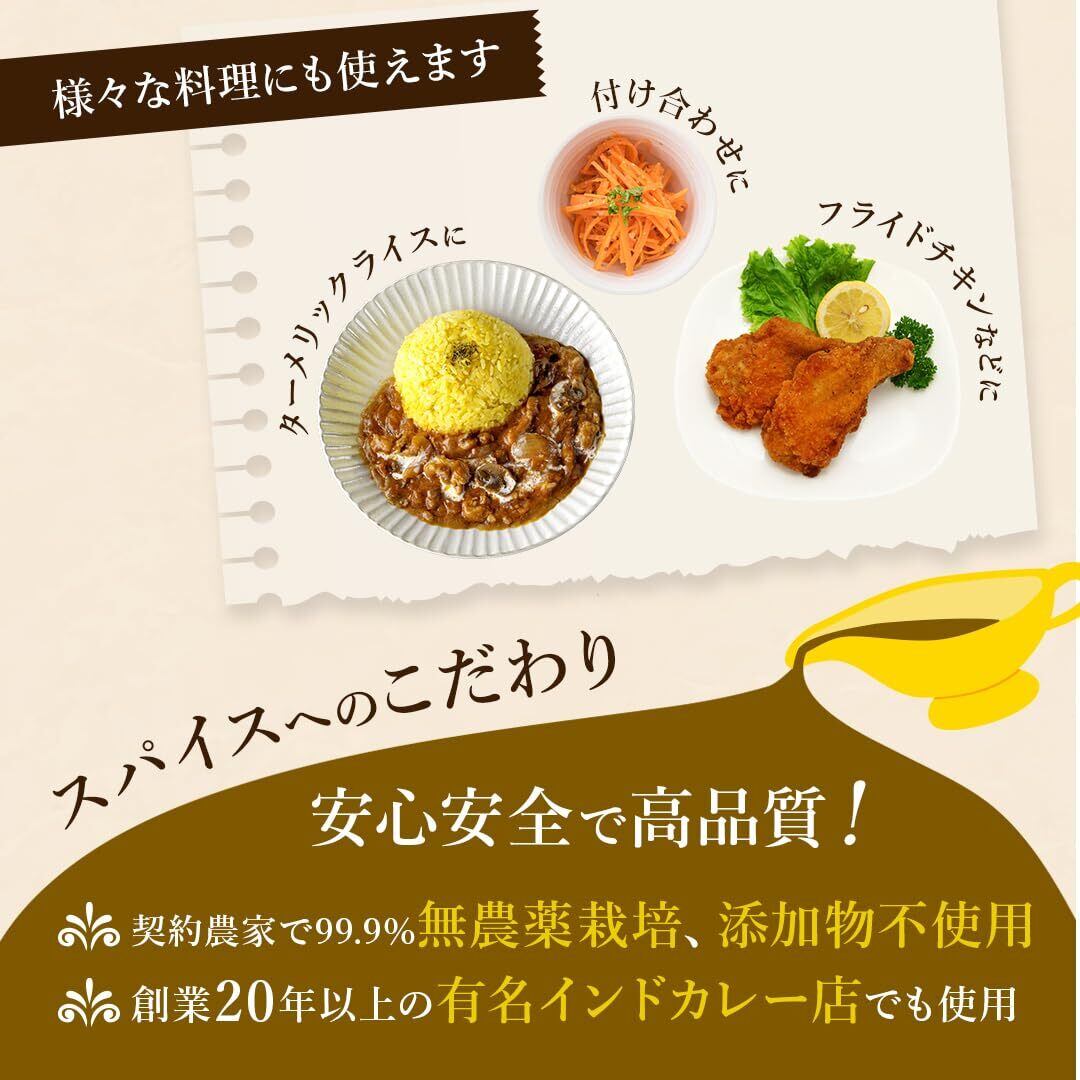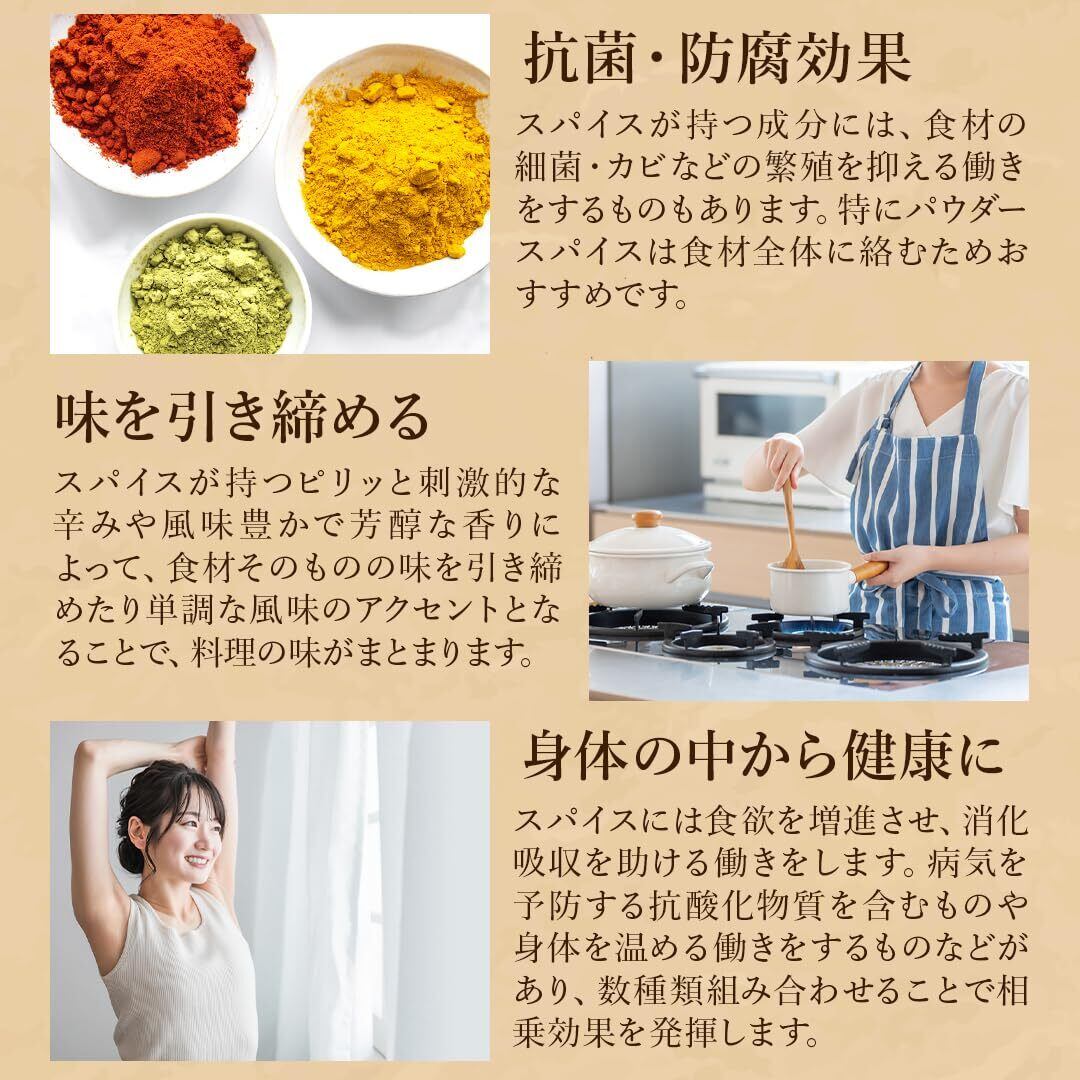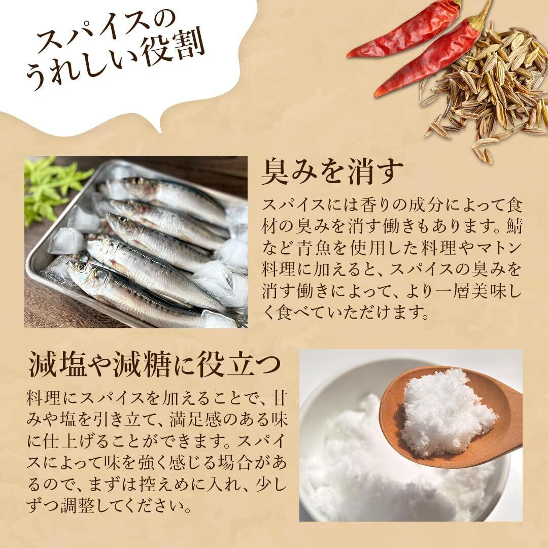 【D'stsカレースパイスの特徴】「ターメリック」「クミン」「コリアンダー」は、カレーづくりにマストなスパイス。どんな種類のカレーもベースにはこの3つを使うことが多いです。また「チリパウダー」は肉や魚の臭みを抑える効果があり、スパイシーな辛味で食欲をそそります。あらかじめ必要なスパイスが必要なだけ揃っているスパイスセットです。