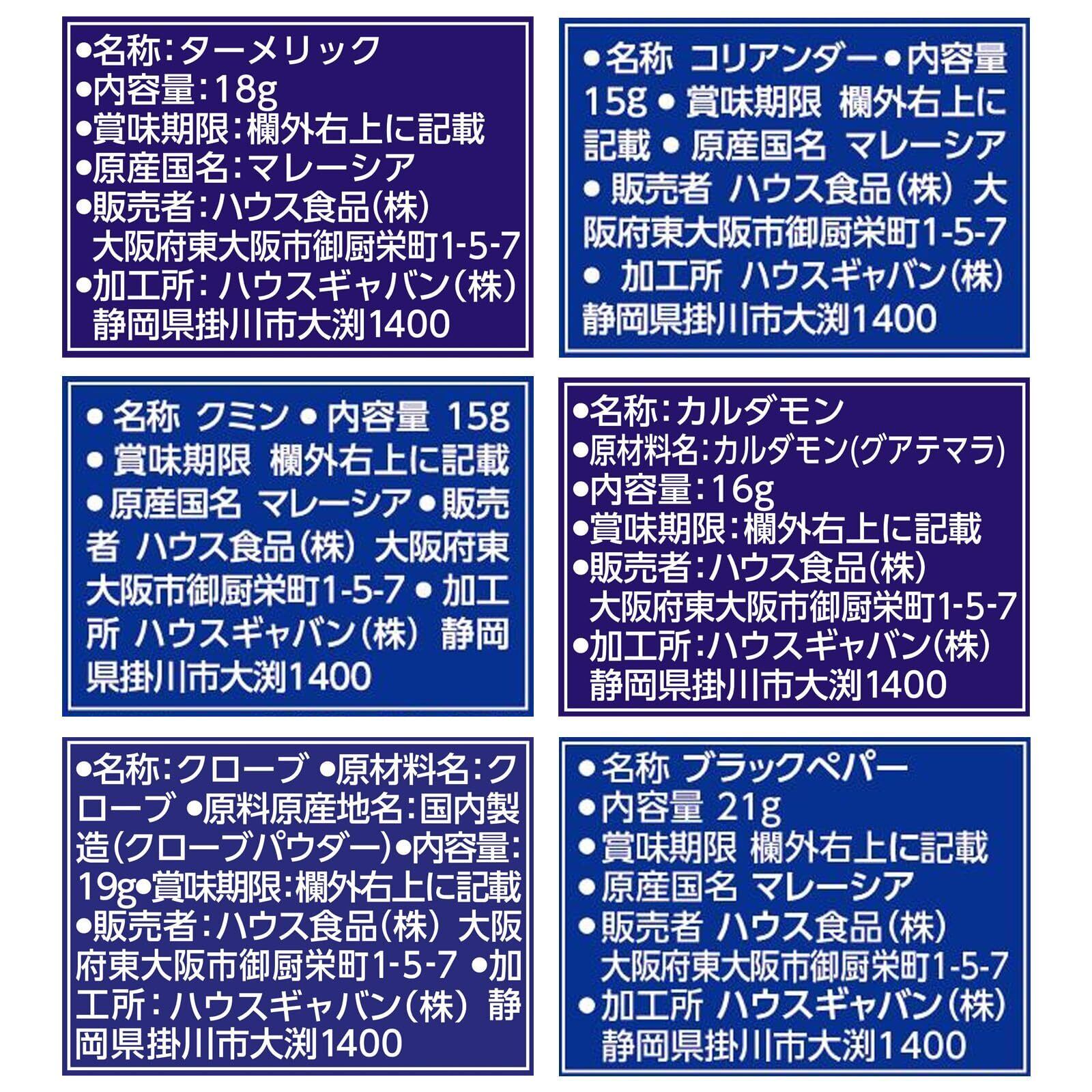 ●GABAN ターメリック…(原産国名:マレーシア) ●GABAN コリアンダー…(原産国名:マレーシア) ●GABAN クミン…(原産国名:マレーシア) ●GABAN カルダモン…(原料原産地名:グアテマラ) ●GABAN クローブ…(原産国名:日本) ●GABAN ブラックペパー…(原産国名:マレーシア)