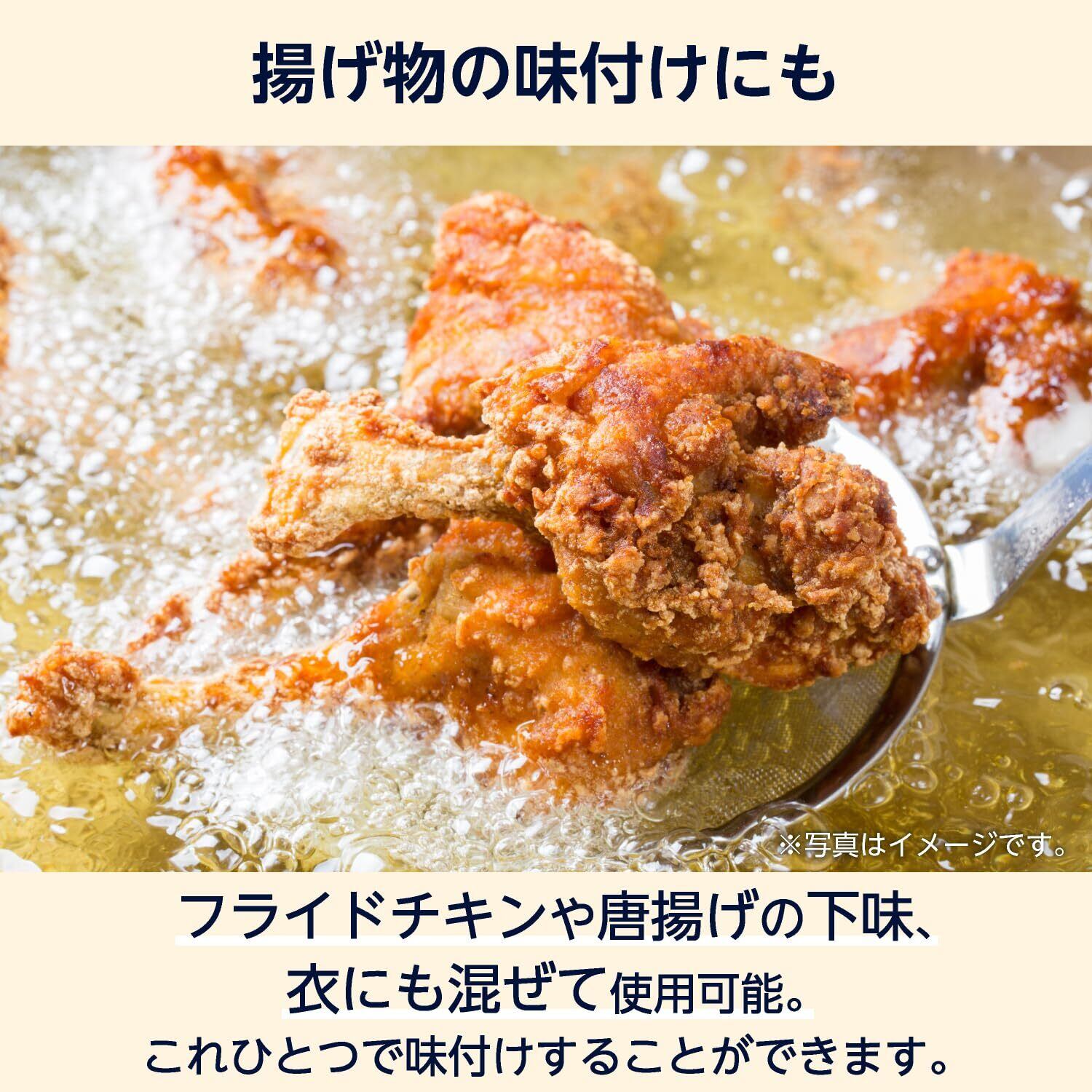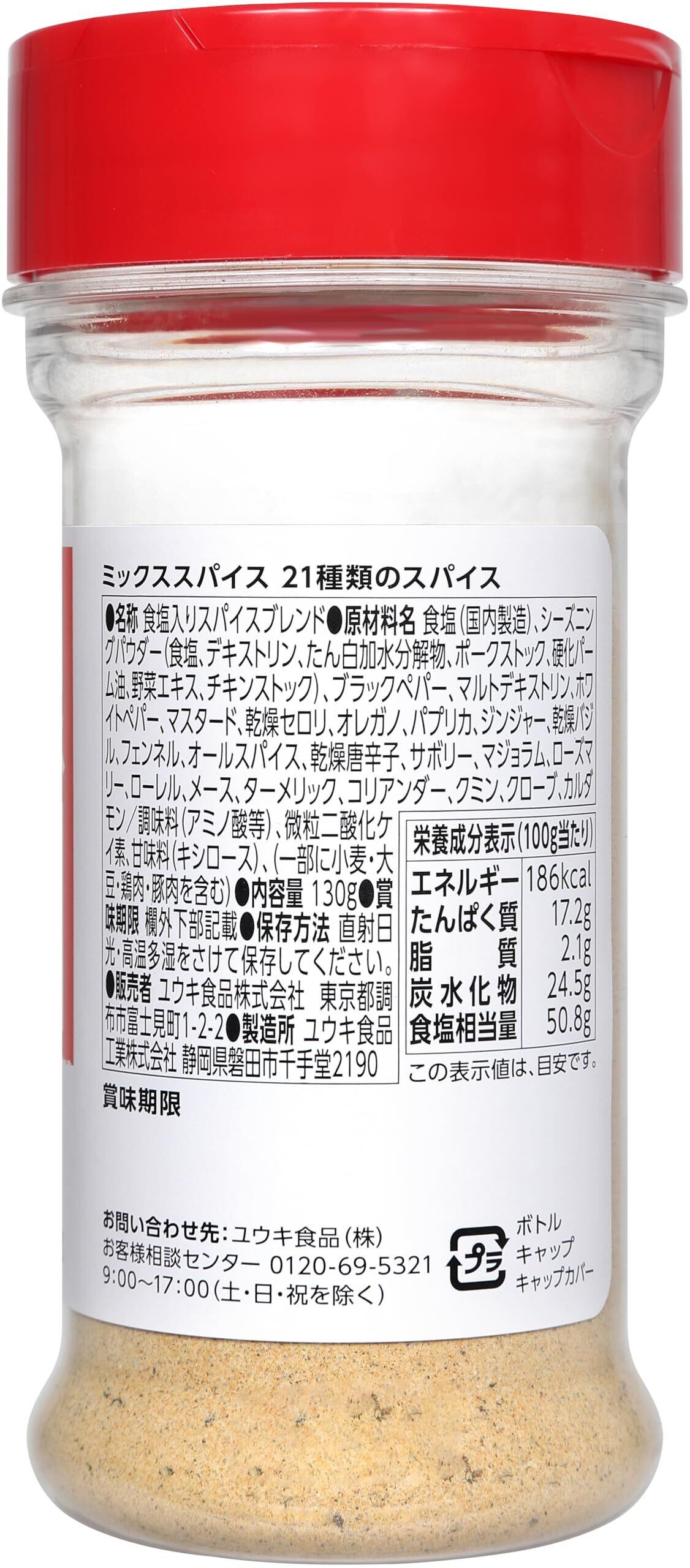 原材料:食塩(国内製造)、シーズニングパウダー(食塩、デキストリン、たん白加水分解物、ポークストック、硬化パーム油、野菜エキス、チキンストック)、ブラックペパー、マルトデキストリン、ホワイトペパー、マスタード、乾燥セロリ、オレガノ、パプリカ、ジンジャー、乾燥バジル、フェンネル、オールスパイス、乾燥唐辛子、サボリー、マジョラム、ローズマリー、ローレル、メース、ターメリック、コリアンダー、クミン、クローブ、カルダモン/調味料(アミノ酸等)、微粒二酸化ケイ素、甘味料(キシロース)、(一部に小麦・大豆・鶏肉・豚肉を含む)