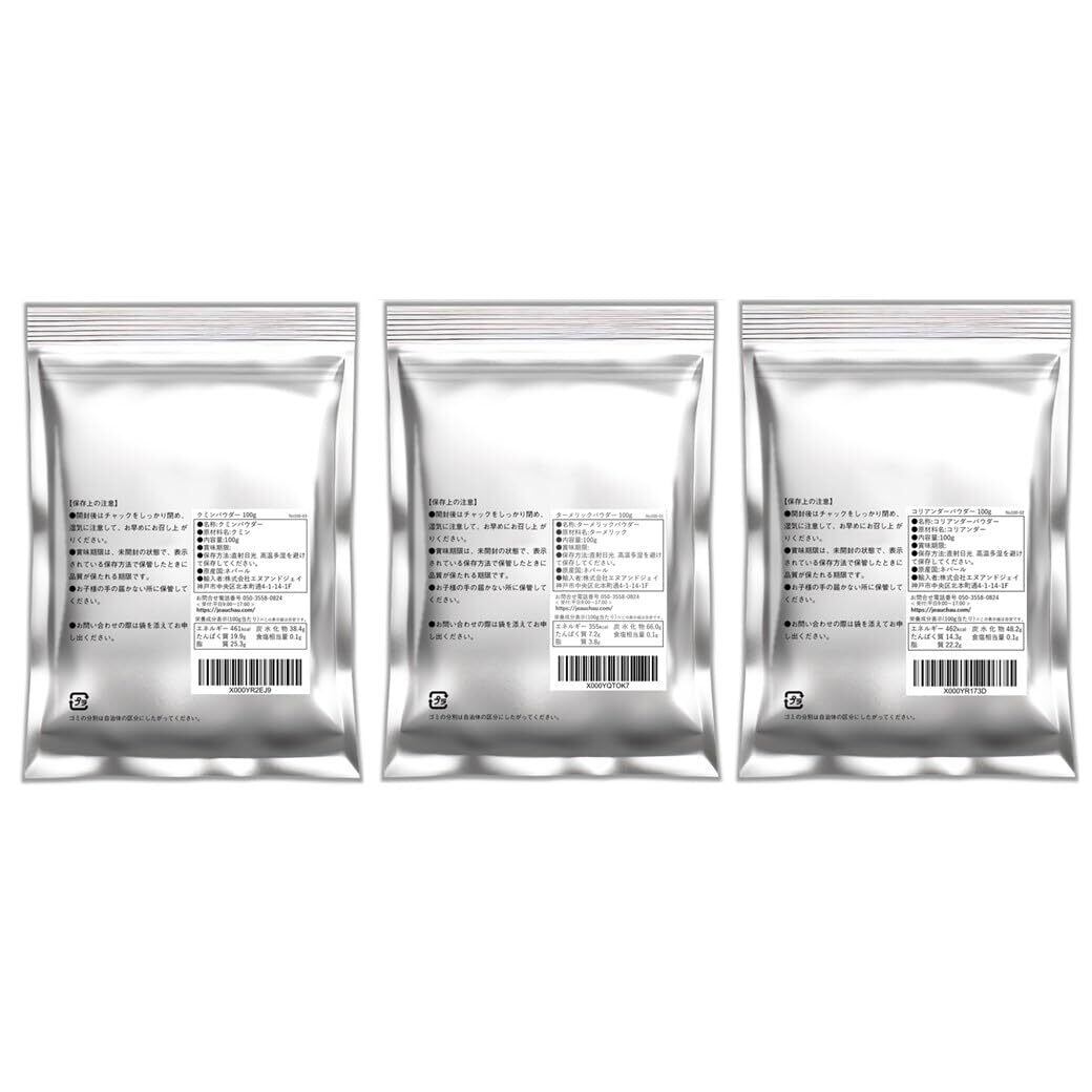 【商品詳細】内容:クミンパウダー100g(ネパール産) ターメリックパウダー100g(ネパール産) コリアンダーパウダー100g (ネパール産) / 賞味期限:収穫から約2年 / 保存方法:直射日光、高温多湿を避けて保存してください。