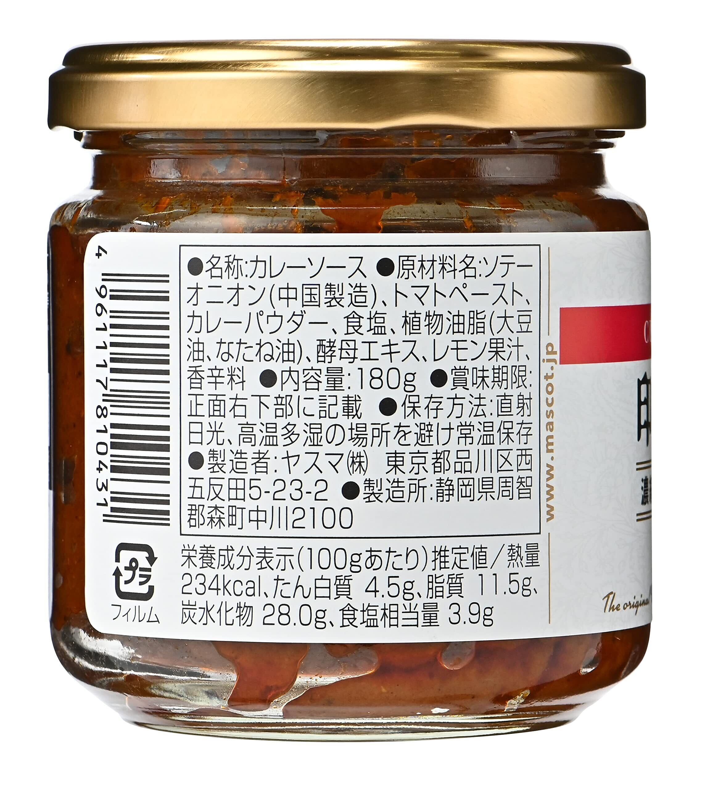 原材料:オニオンソテー、トマトペースト、カレーパウダー、食塩、植物油脂(大豆油、なたね油)、酵母エキス、レモン果汁、香辛料