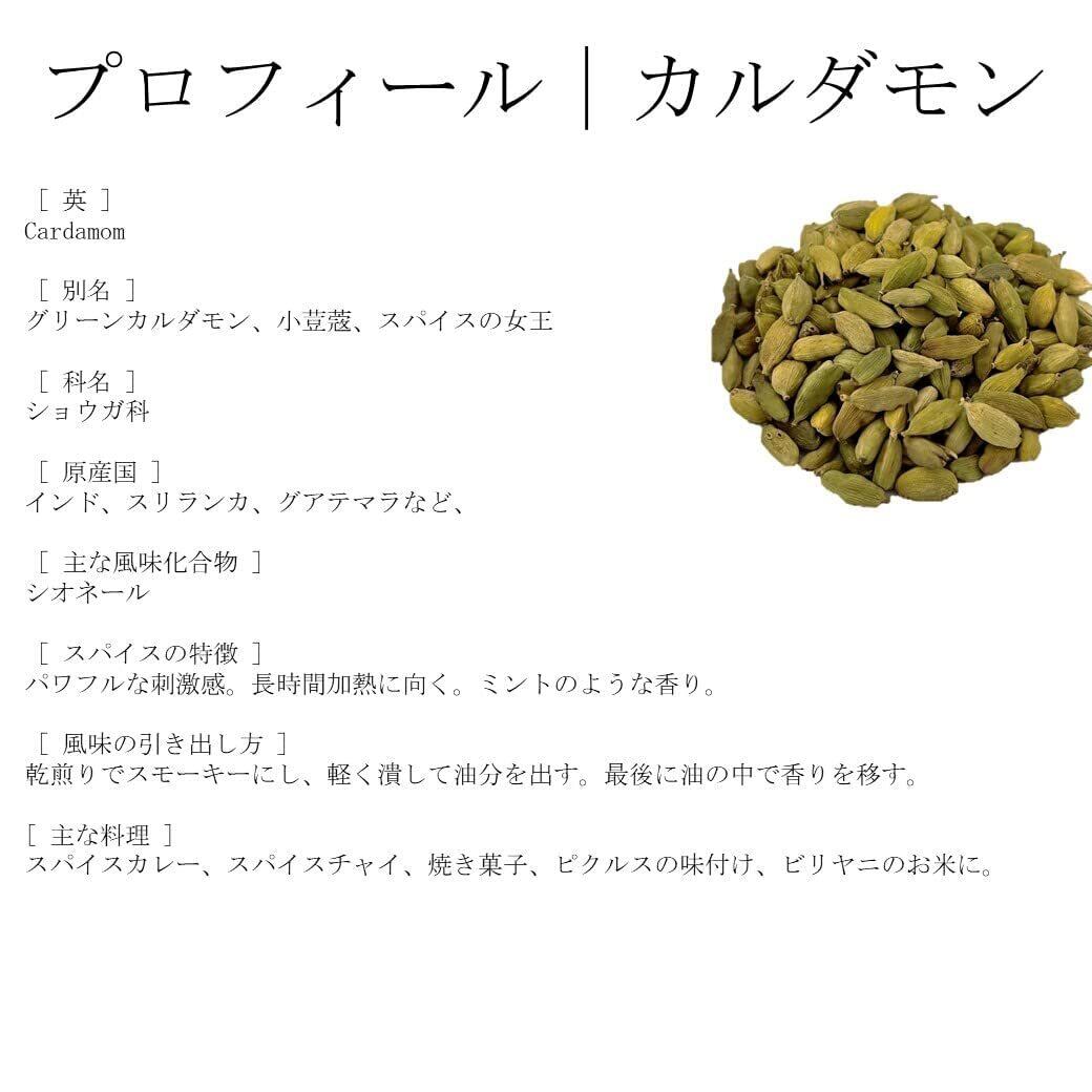 【本物のスパイスをご自宅で】カルダモンはスパイスの女王とも呼ばれ、ショウガ科のスパイスです。パワフルな刺激感があり、長時間の過熱に向き、ミントのような香りがします。酢の物にカルダモンを軽く潰して一緒に付け込んだり和食にも合います。