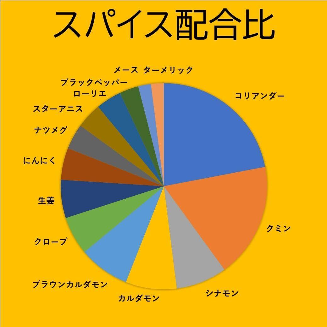 種類 アニス, カルダモン, クミン, クローブ, コリアンダー, シナモン, ジンジャー, ナツメグ, ニンニク, ブラックペッパー, メース, ローリエ