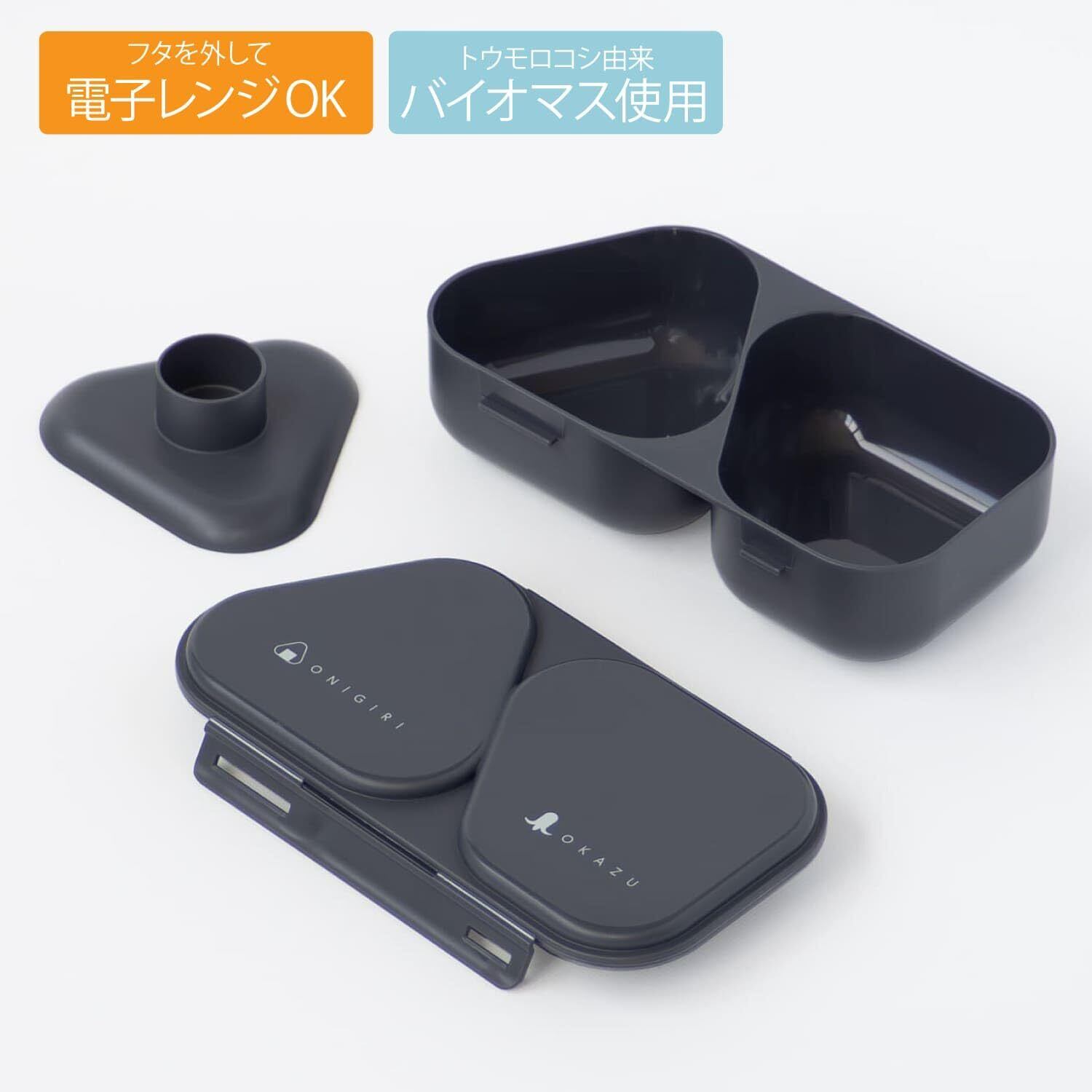 今日はおにぎり1つとおかず、今日はおにぎり2つ、など自由な組み合わせができます。 抗菌剤添加。銀イオンの抗菌力が樹脂表面の細菌の増殖を抑制します。 トウモロコシ由来のバイオマス原料を約10%使用しており、CO2排出量の削減に貢献しています。