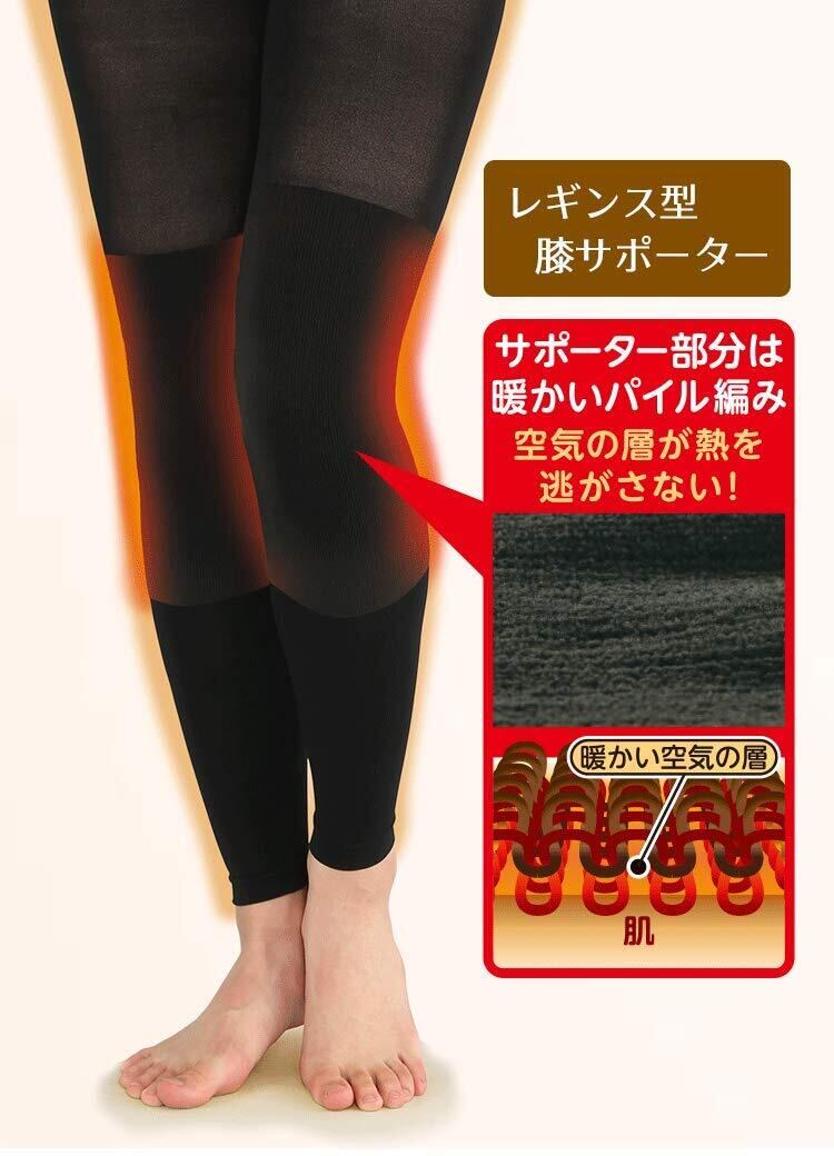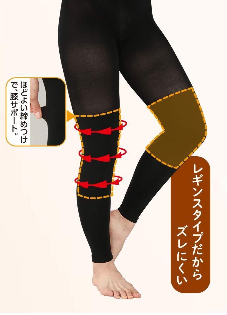 ■冷えでツラい膝がラクに! 暖かくてズレにくい! 膝サポーターとレギンスが一本化したレギンス型膝サポータです。 ほどよい締めつけで膝をサポートしながら、ズレにくく快適に履くことができます。 サポーター部分は暖かいパイル編みになっており、寒さから膝を優しく守ります。