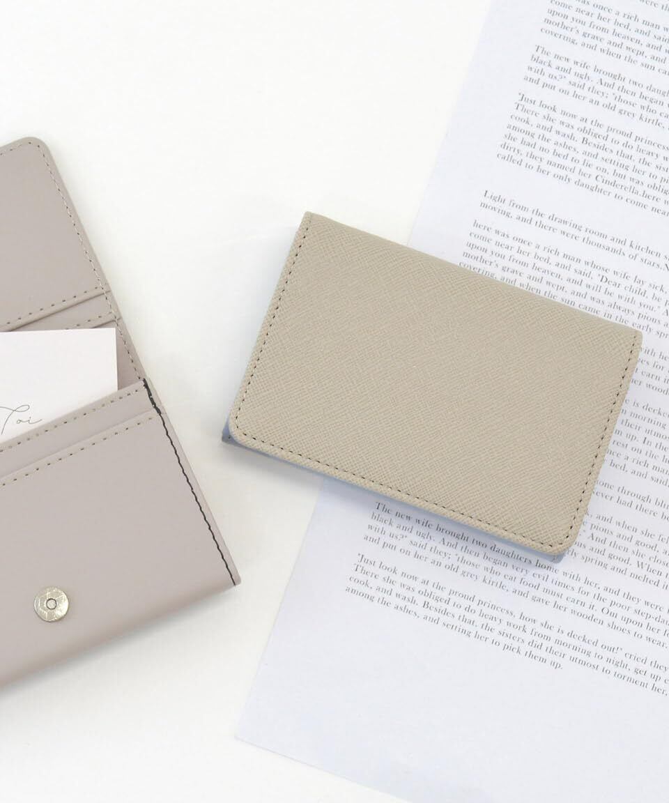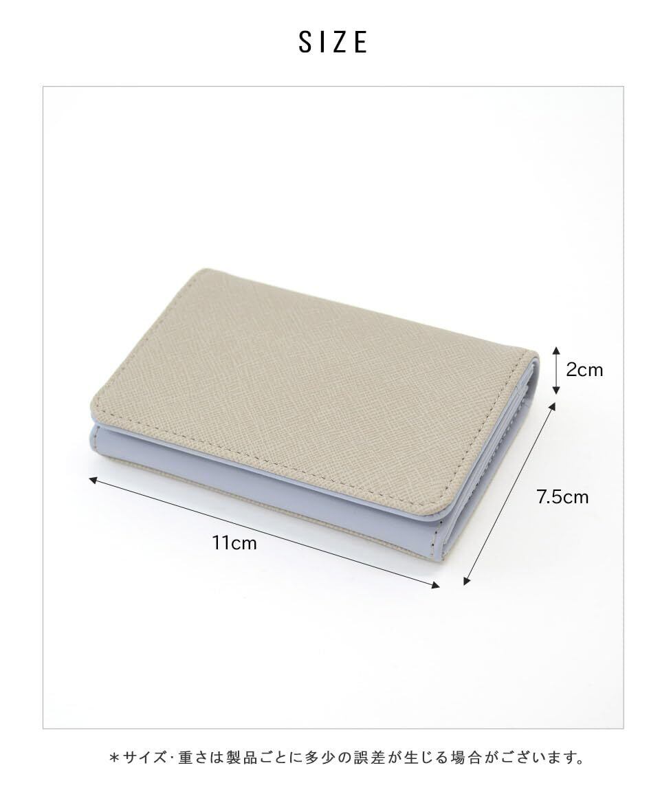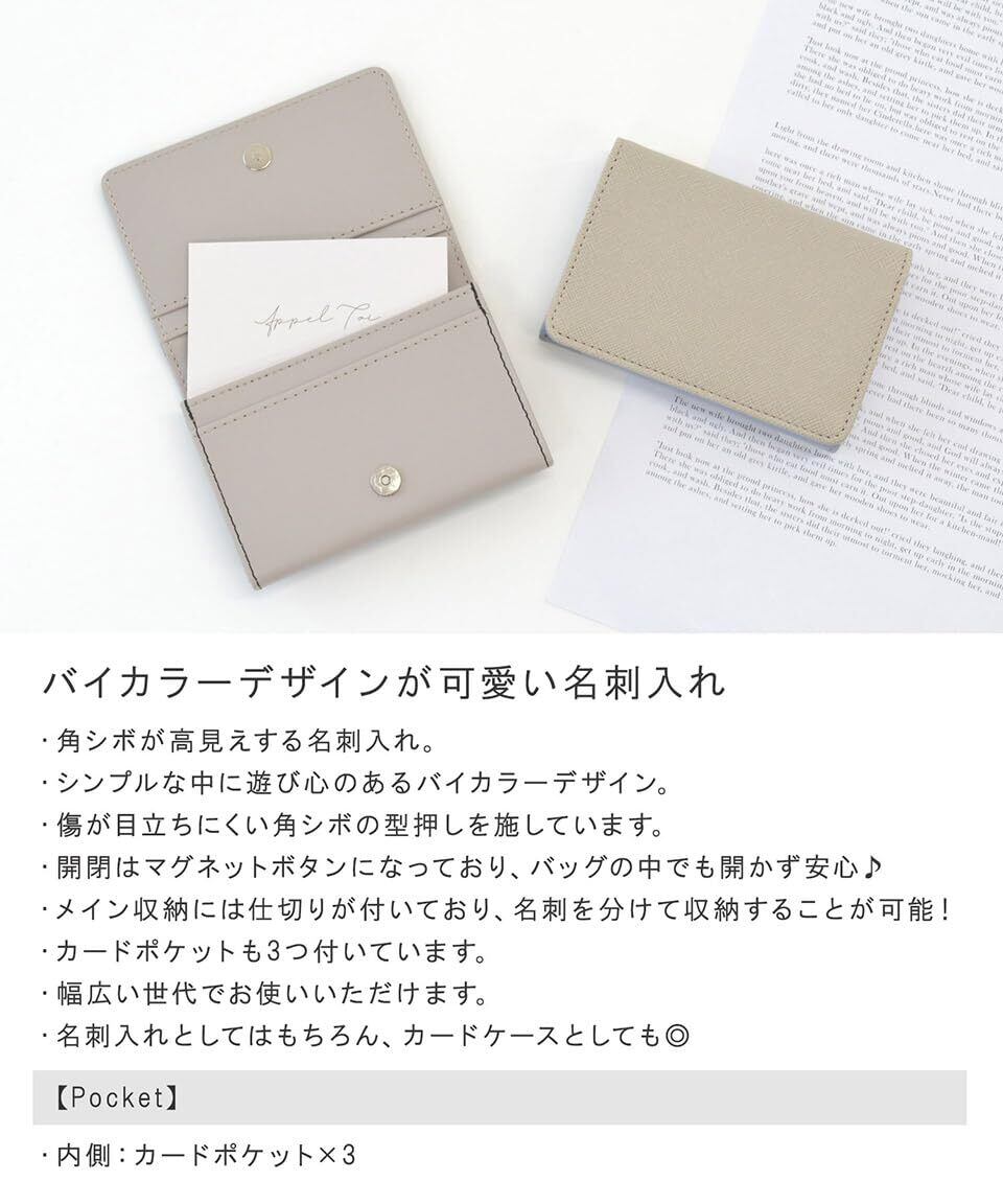 ・角シボが高見えする名刺入れ。・シンプルな中に遊び心のあるバイカラーデザイン。・傷が目立ちにくい角シボの型押しを施しています。・開閉はマグネットボタンになっており、バッグの中でも開かず安心・メイン収納には仕切りが付いており、名刺を分けて収納することが可能!・カードポケットも3つ付いています。