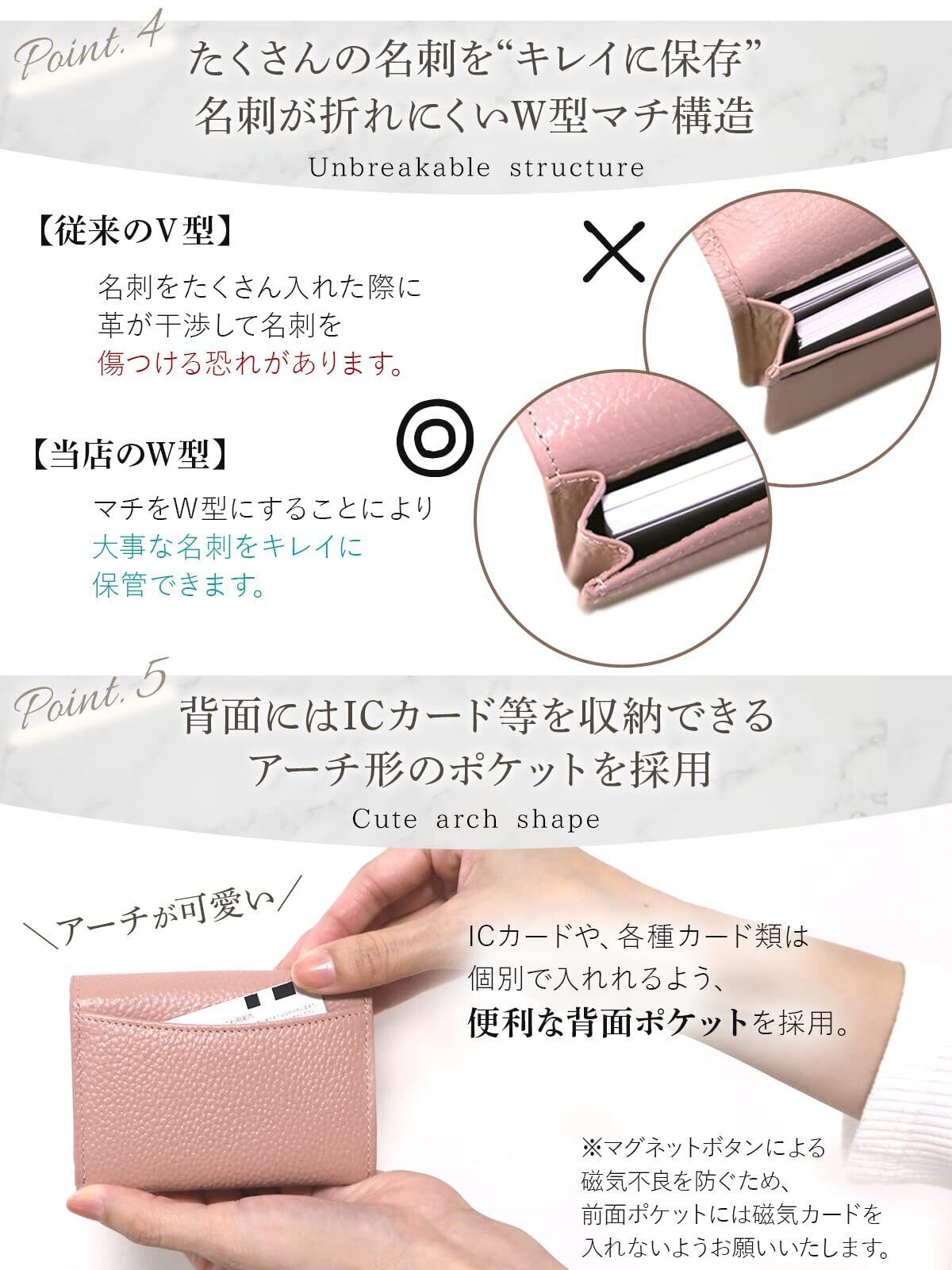 【W型マチで名刺50枚収納】 厚みを抑えたスリムな見た目ながら、名刺を最大50枚まで収納可能。W型のマチ構造により、名刺の角が折れたり圧迫されたりすることなく、美しい状態で保管できます。