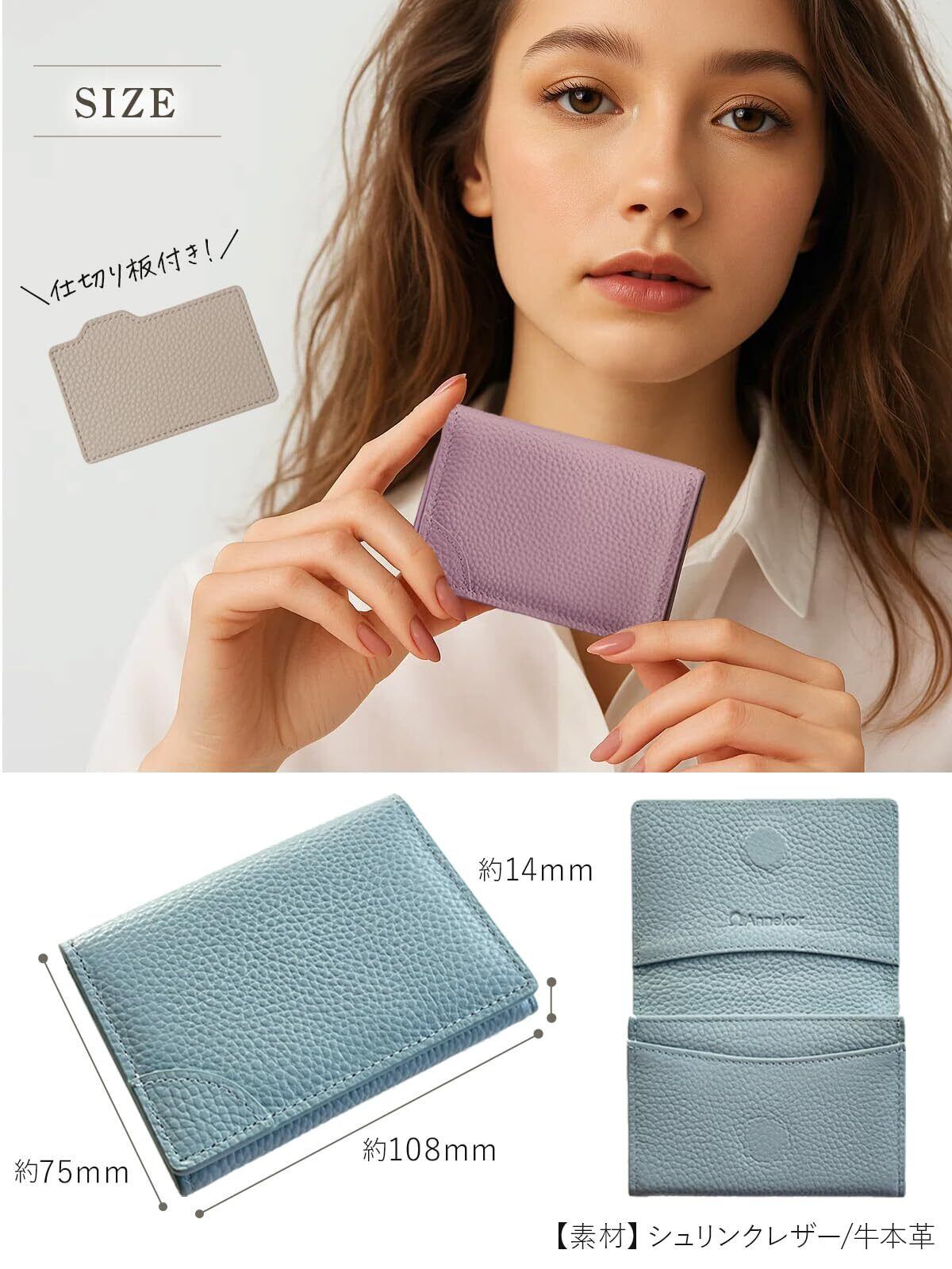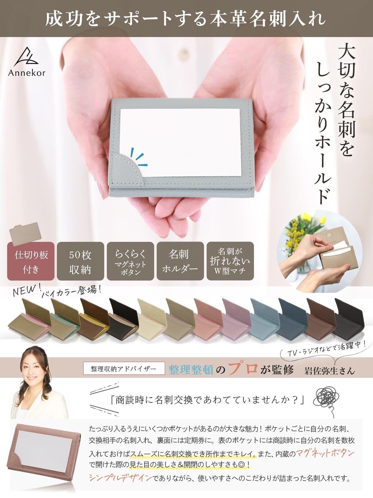 【大切な名刺をしっかりホールド】 商談中に資料を広げたときなど、名刺入れを動かして相手の名刺を落としてしまった…そんなご経験はありませんか?Annekorの名刺入れは、名刺がずれないよう「ホールドポケット」付き。日本の一般的な名刺サイズに合わせた設計で、安心して商談に集中できます。