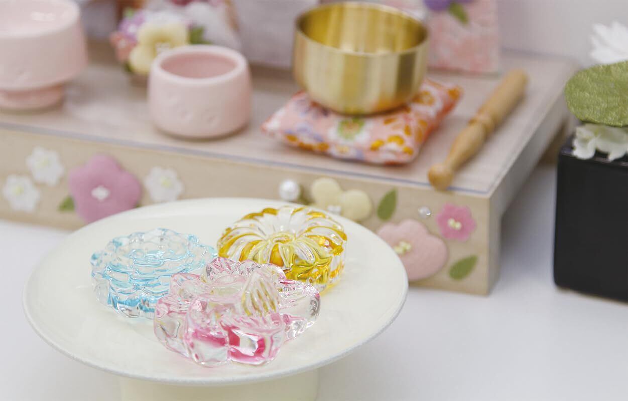 お盆飾りを硝子細工で作りました。光きらめく透明感。お供えのお菓子の形をしたガラス製のお飾りです。