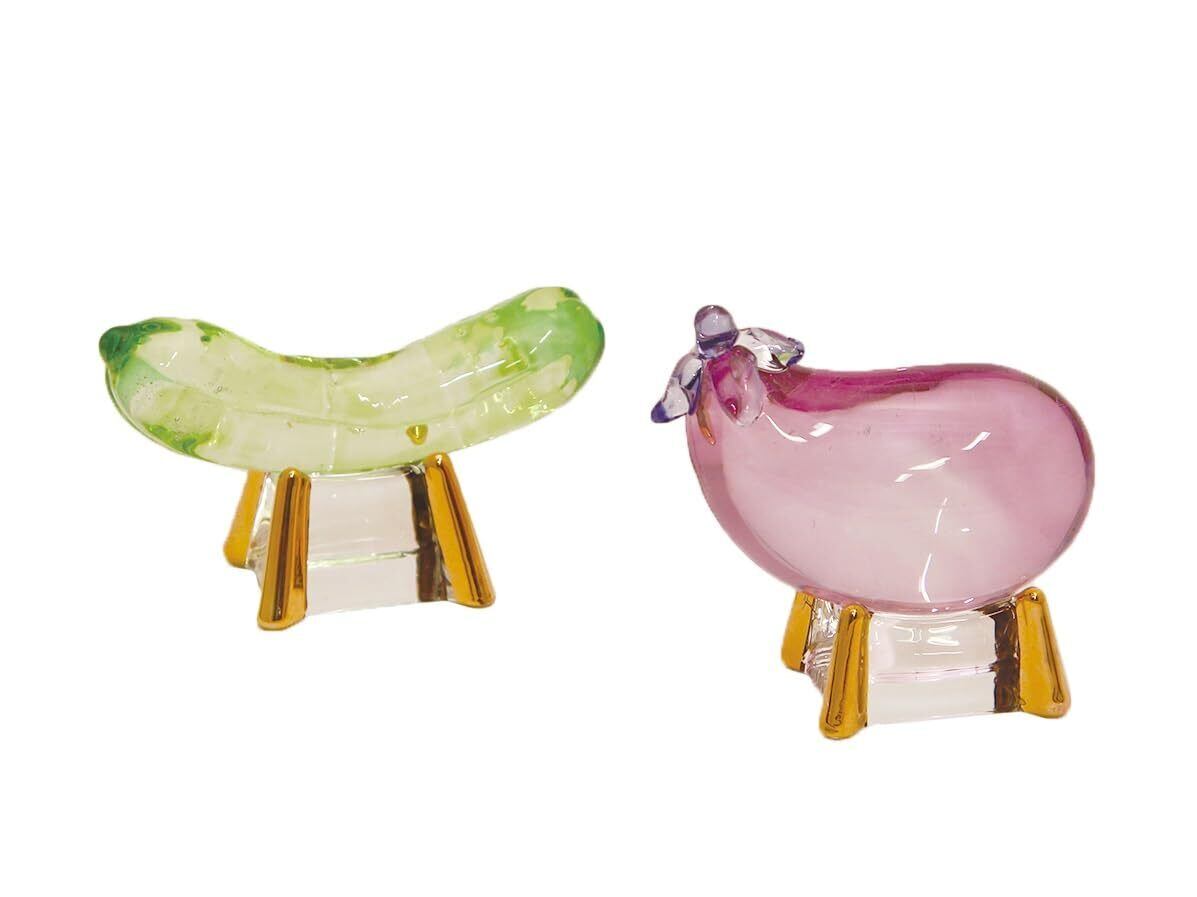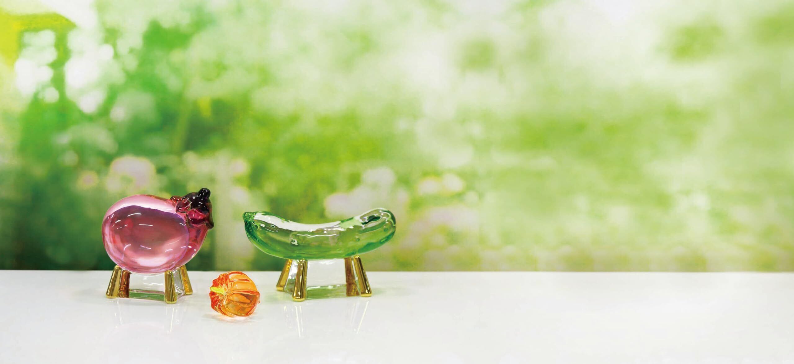 お盆飾りを硝子細工で作りました。光きらめく透明感。硝子の精霊馬はキラキラと輝きます。