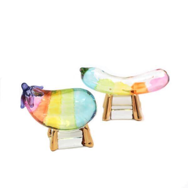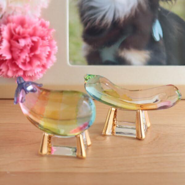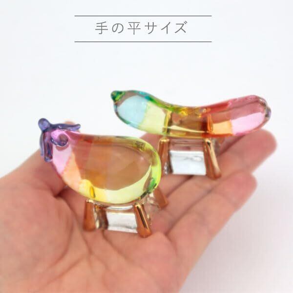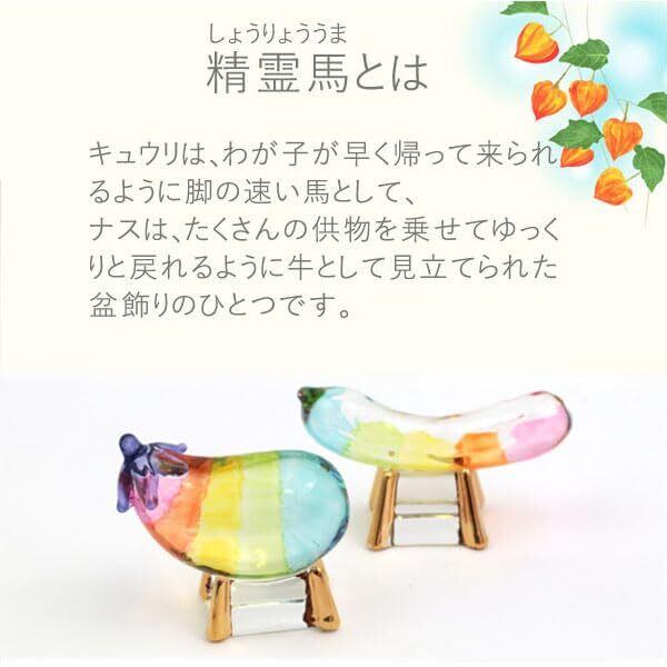 お盆飾りの、必需品「精霊馬」。 お盆に、虹の橋からわが家に帰る時に使用する乗り物(馬)を、きゅうりで、 お盆が終わり、虹の橋に帰る時に使用する乗り物(牛)を、なすで作るのが一般的です。 淡く彩色されたガラス製の精霊馬は、虹の橋の虹のように輝きます。 犬、猫、ペットちゃんの乗り物にぴったりな ミニサイズで、きれいでかわいい精霊馬です。