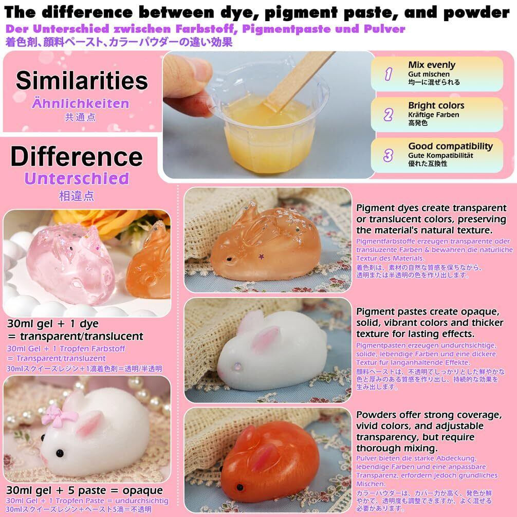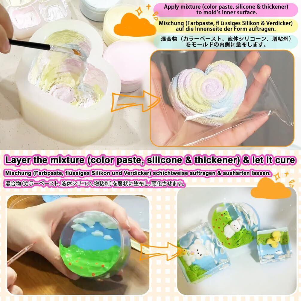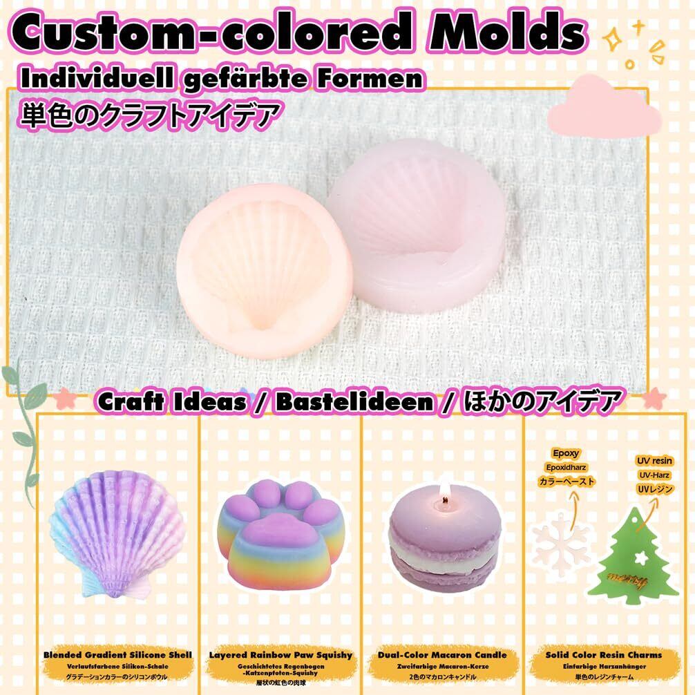 混ぜると硬化不良と形成不良にならないので、スクイーズだけではなく、柔らかいジェル、ゴム型、伸縮性のあるパテ、キャンドルなどに適用し、シリコン工芸やDIYアートプロジェクトに最適です。