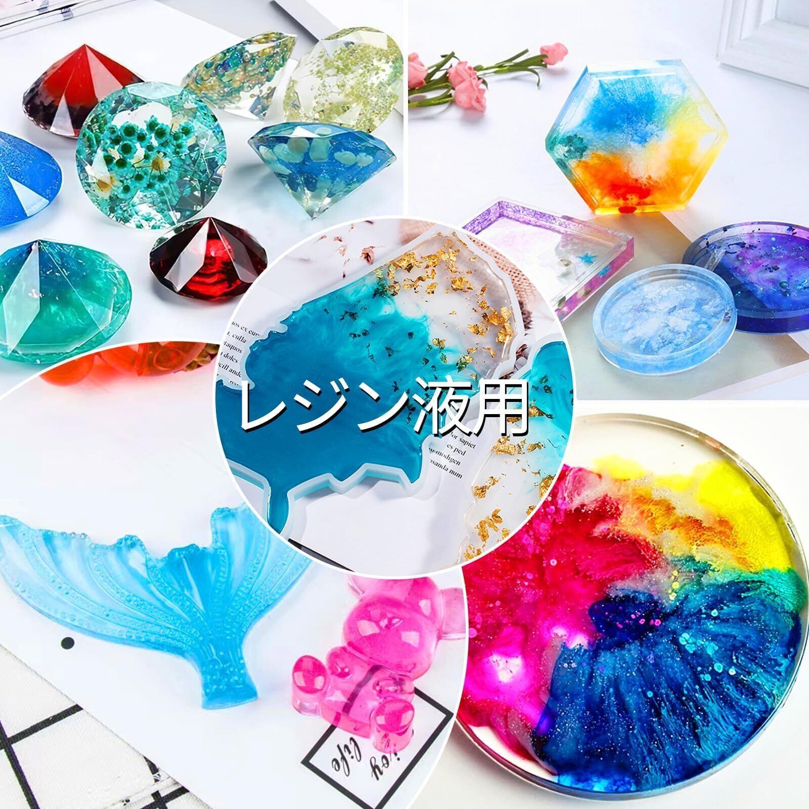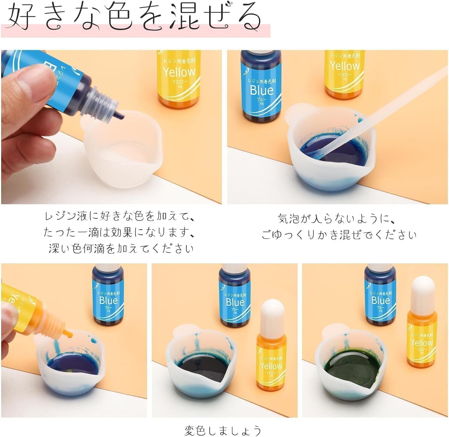 使用方法: ①レジン液を調色カップやパレットに注ぎます ②少量ずつ本製品をレジン液に混ぜ、スティックなどを使用して気泡が入らないようにゆっくりかき混ぜます。 ③お好みのレジン用モールドに注ぎ入れ硬化させます。
