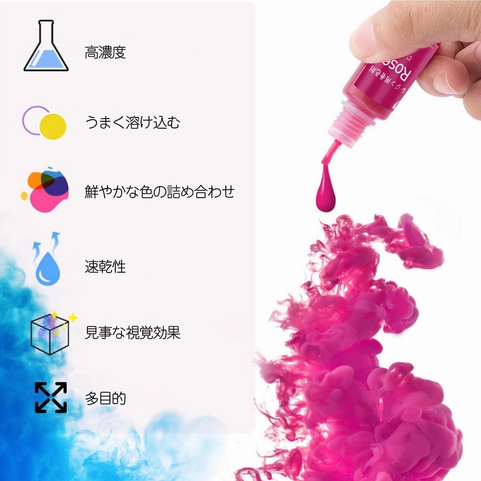 優れた発色性能と透明性: レジン着色剤セットは色あせにくく、高品質のエポキシ樹脂顔料を使用されます。安心してお使いいただける無毒、無刺激な商品です。 液体型のレジン液着色剤で、美しい色合いを実現します。レジン液との混合も簡単で、お好みの色を軽松に作成できます。