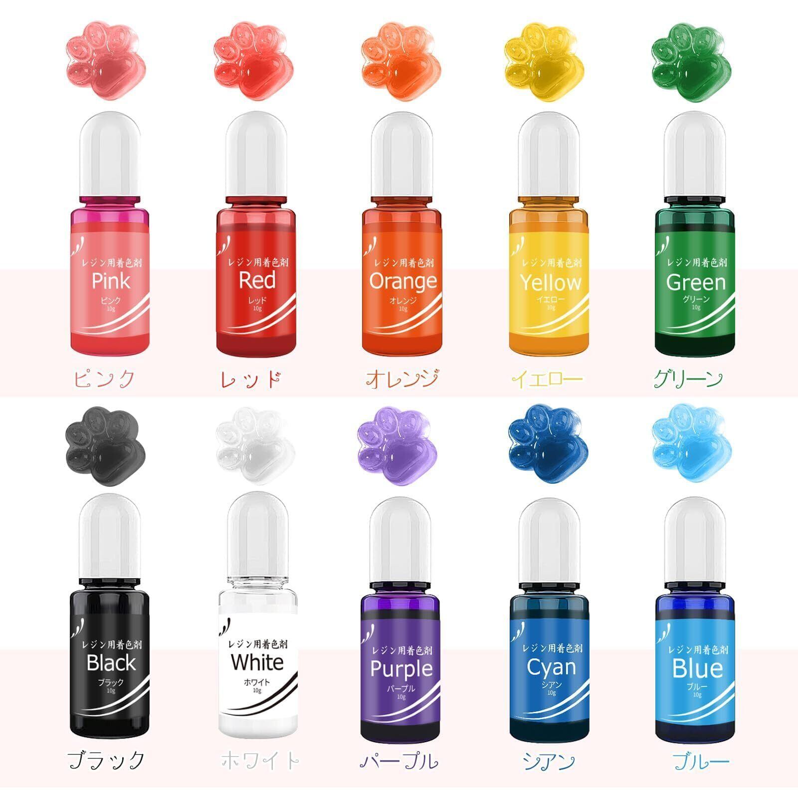 レジン着色剤10色*10mlセット: 新登場のレジン液着色剤セット!10色×10mlの高品質染料を採用し、シリコンボウル×2、シリコンスティック×3、指カバー×2。褪色や変色の心配ありません。無味、無毒、刺激なしで安心してご利用いただけます。
